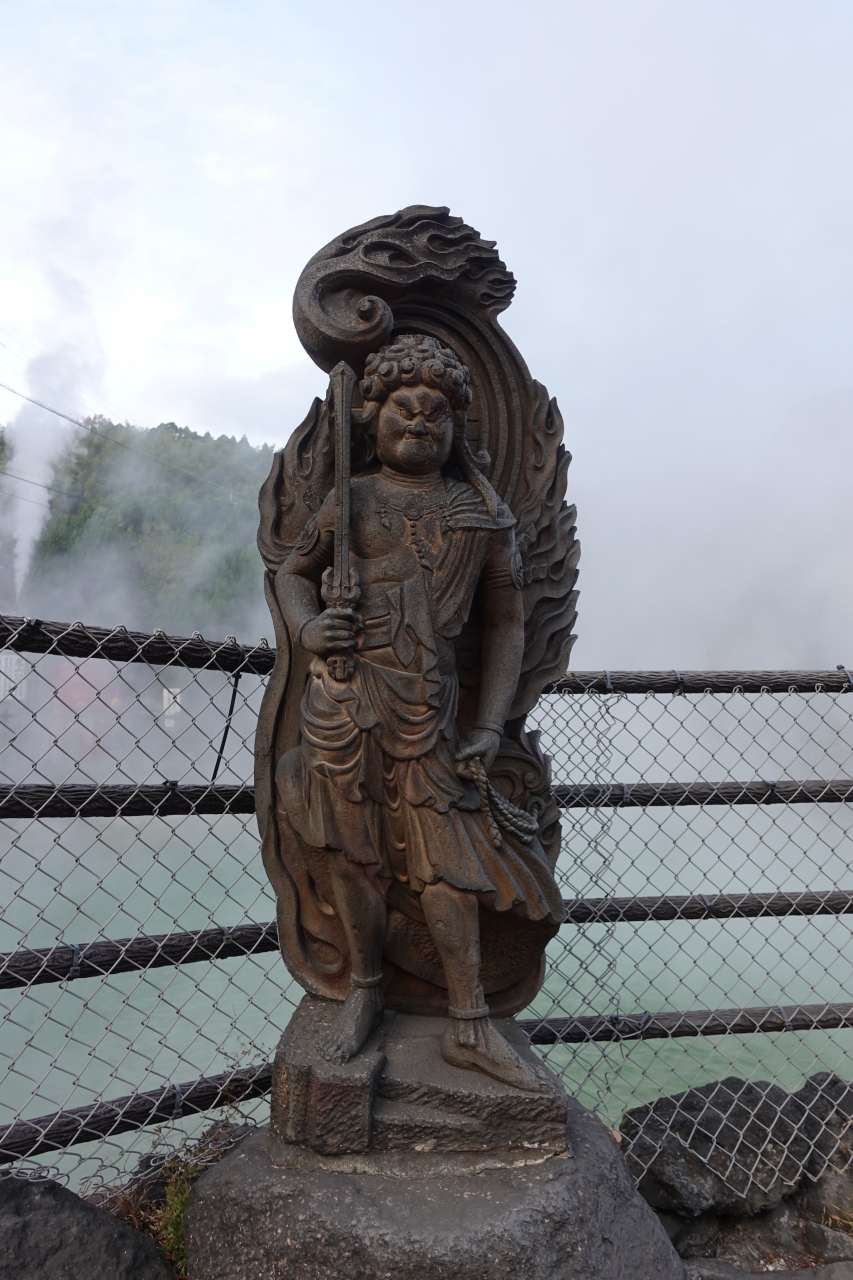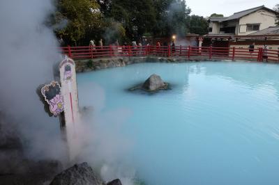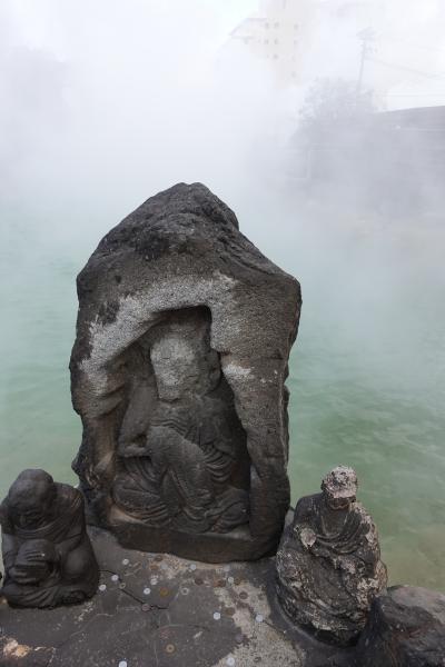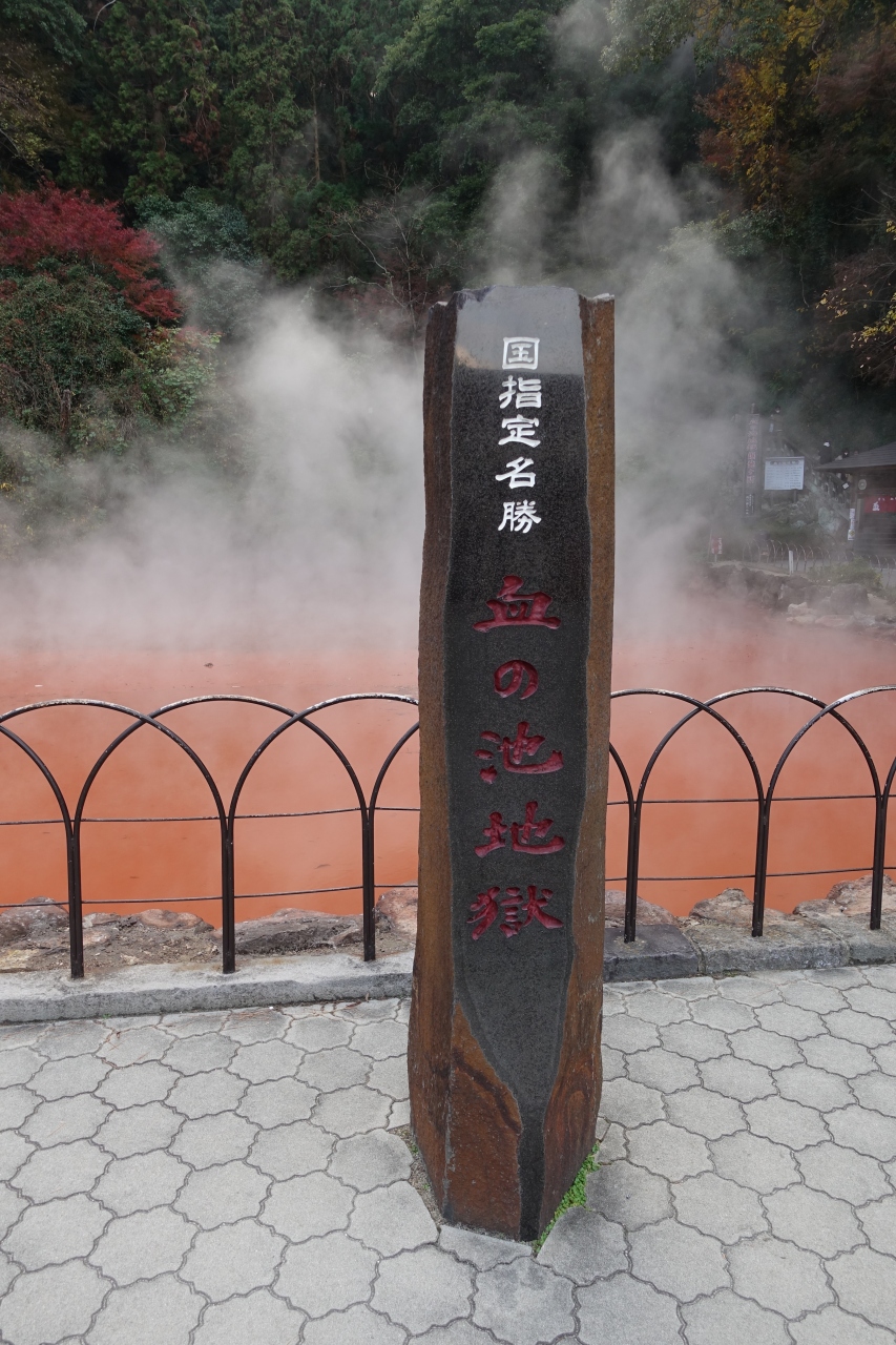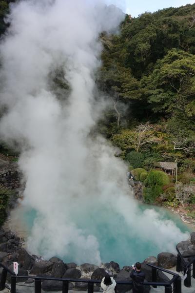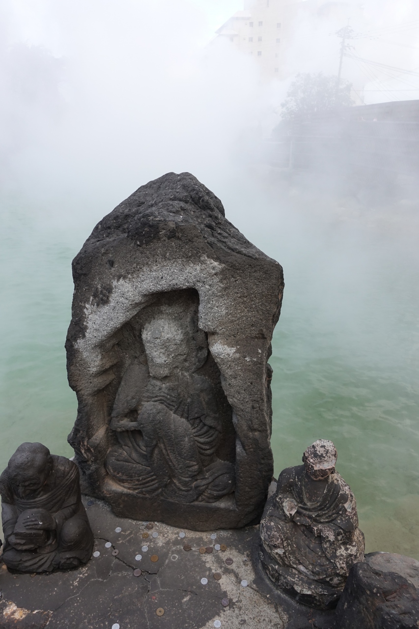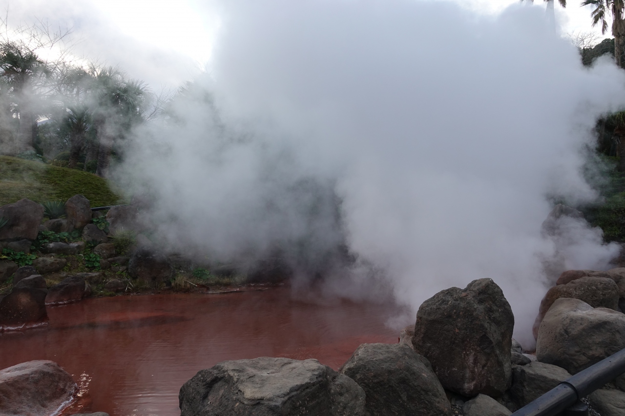 大きな売店を抜けるとモウモウと湯気と立てている青い池の海地獄がありました。