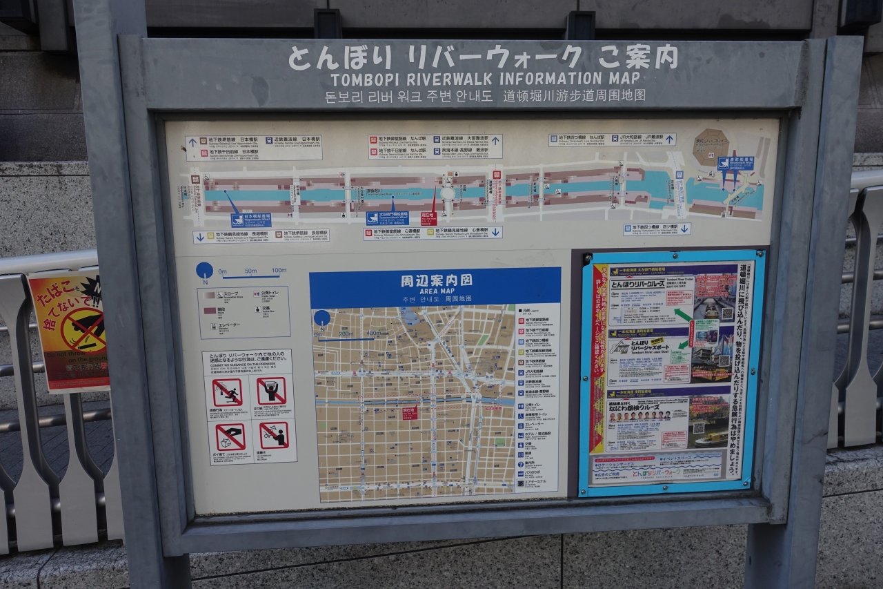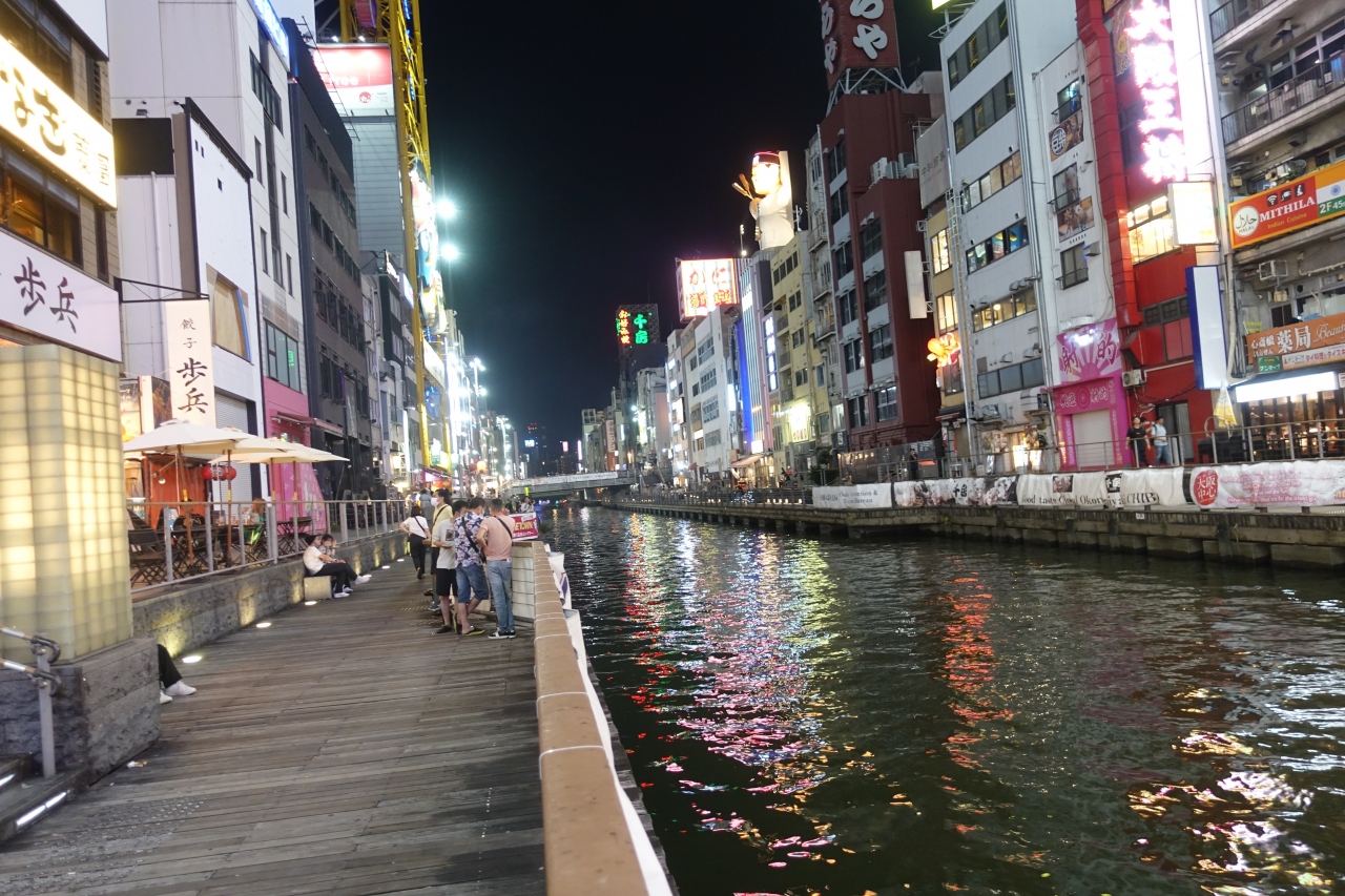 道頓堀川沿いには広いボードウォークがあって雰囲気がいいです。