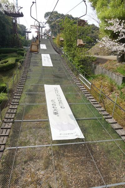リフトは下の防護ネットに川柳だか俳句だかスローガンだかを買いてあります。