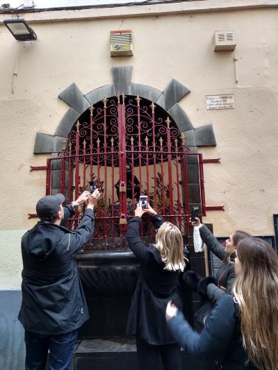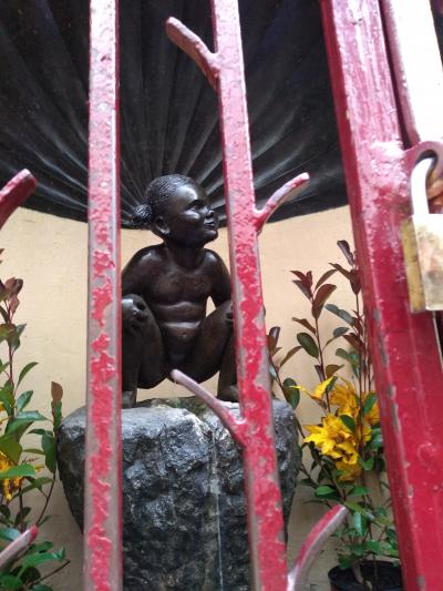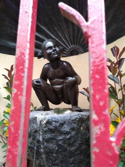 小便小僧とは違い鍵付きの柵の中に閉じ込められているので、なぜだろうと思い調べてみると、「手が届く位置にあるため、像に触る人が後を絶たず、像の局部周辺が禿げ上がって来たために柵が設置された(Wikipedia)」だそうです。