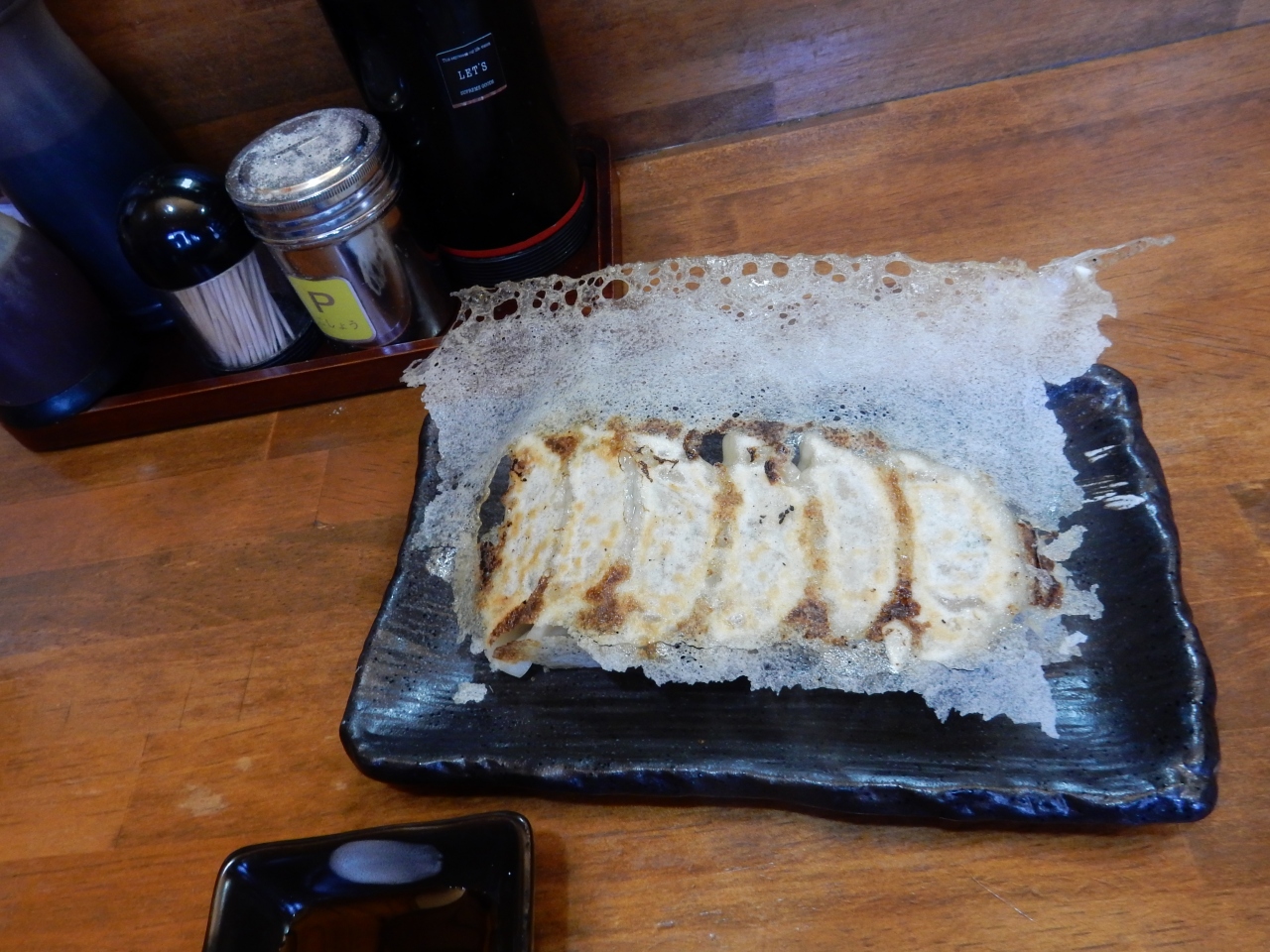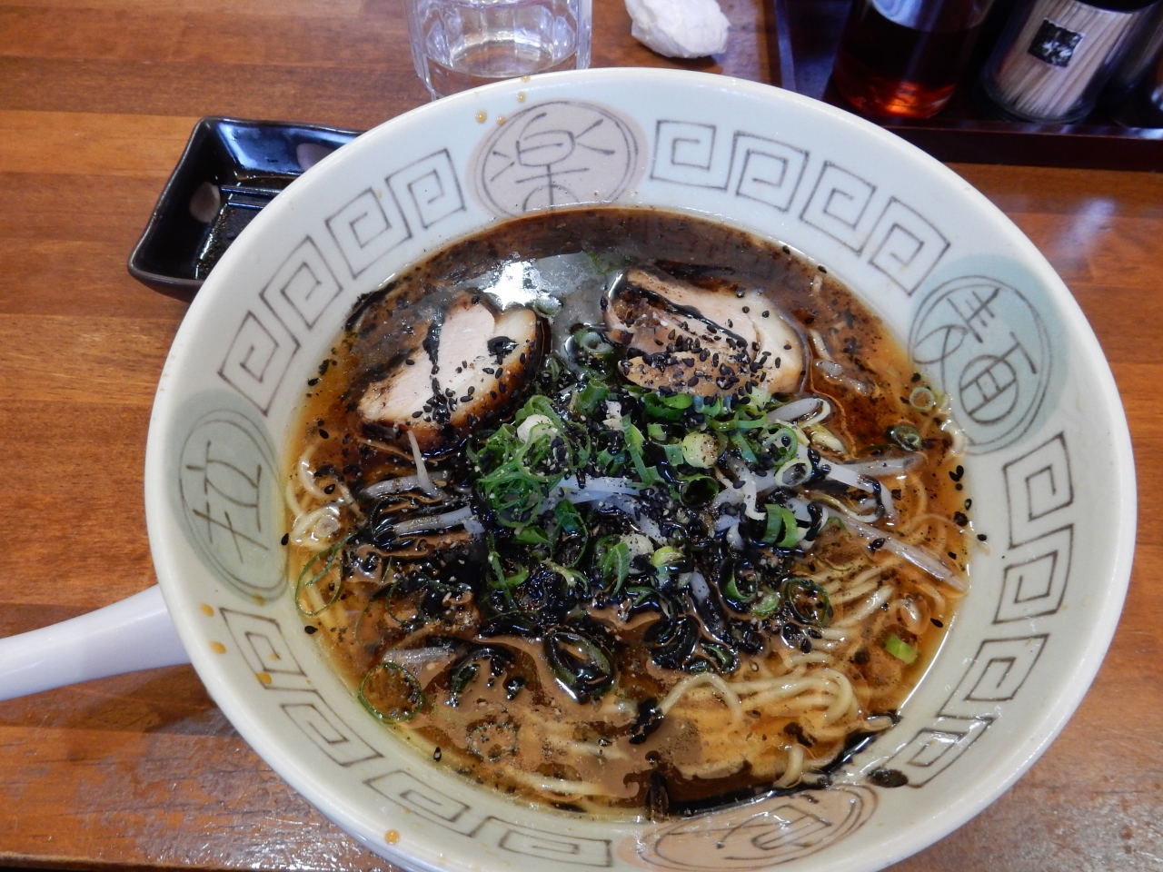 天橋立から鳥取に向かう途中豊岡に寄ったので、ここでの人気店ということで検索の上訪れました。着いたときは満席、外に並んでいる方が一組いました。聞くと「美味しい」とのことで期待が高まりましたね。しばらく待って入店。一番人気は味噌ラーメンだそうですが、醤油好きの私は「黒醤油」を注文。