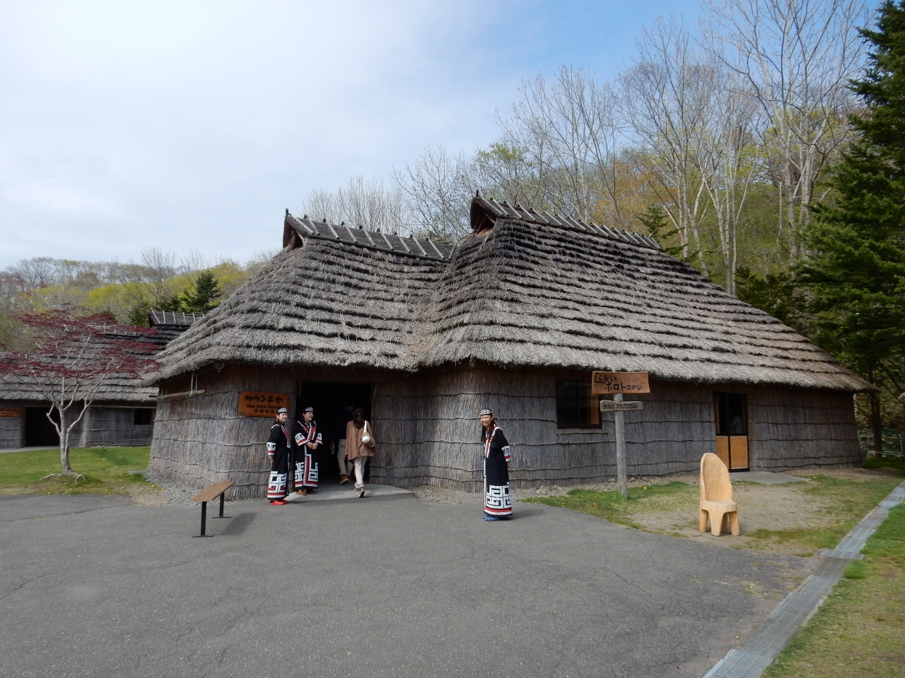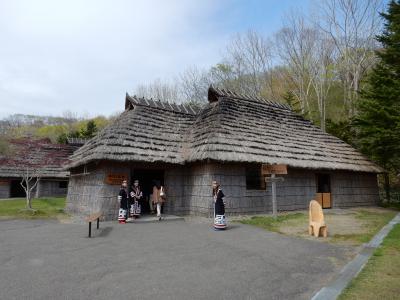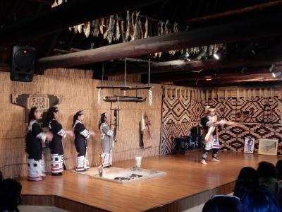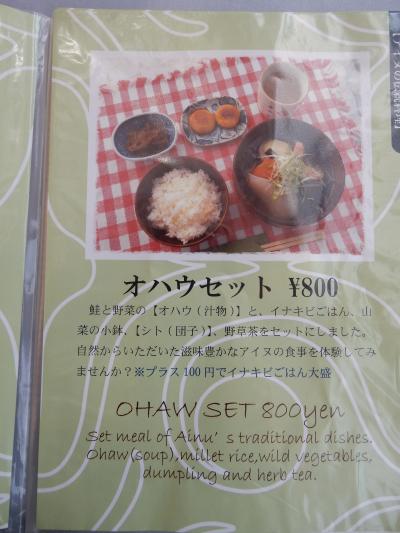 湖のほとりに、アイヌの部落が復元されています。アイヌの歌や踊り、楽器の演奏もあり、勉強になるとともに案外楽しめました。コタン内のカフェでは、アイヌの伝統料理オハウもいただけます。セットで800円ですが、丸ごとのじゃがいも、大きく切ったダイコン、鮭のぶつ切りが入った汁は、薄味で大変美味しかったですよ。