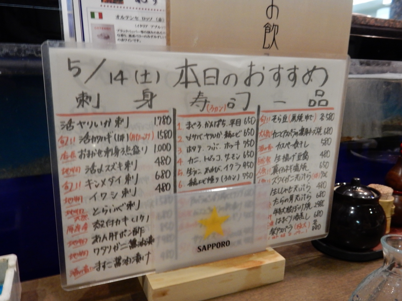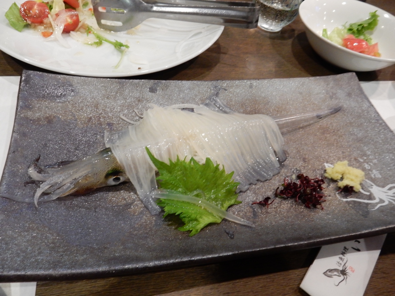 入るなり「ご予約は?」と聞かれましたが、ないというと、2席のみ空いているカウンターに案内されました。予約なしで入れる最後の客だったようです。6時ごろでしたけどね。 イカの活造りは1700円ほどと、近所の倍はしますが、最高に美味しかったです。カワハギの御造り、毛ガニもいただきましたが大変美味でした。酒もいろいろあり楽しめました。ちょっと贅沢でしたが、夫婦で楽しい時間を過ごせました。- 旅行時期