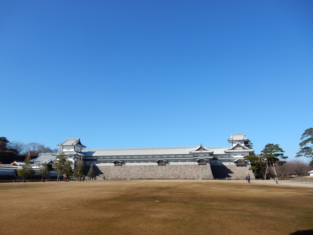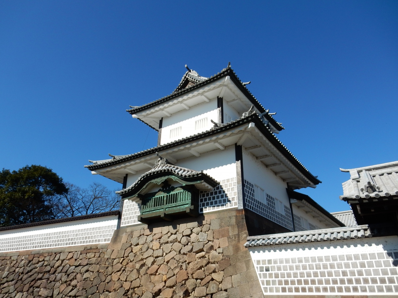 青空をバックに、白い鉛瓦、海鼠壁、黒い鉄の縁取り、実に美しい。前田家の粋を感じます。