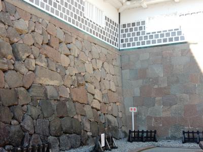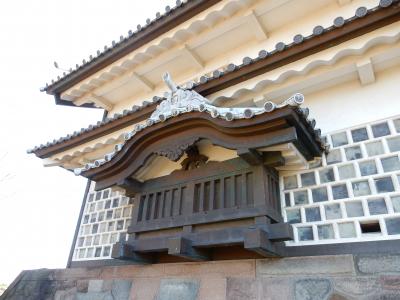 さて、このまま通り過ぎないで裏側に回りましょう! 裏側には銅張の縦格子の出窓が3か所付いていますね。裏側は表と違い戦う表情をしています。聞くところによると、裏側の壁はかなり厚く造られており、艦砲射撃の弾丸から曲輪内の御殿を守ろうとの目的があるそうです。幕末は外国船が来ていましたからね。