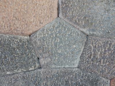 土台の石垣は切込接ぎで、精巧に造られています。五角形の石を見つけました。
