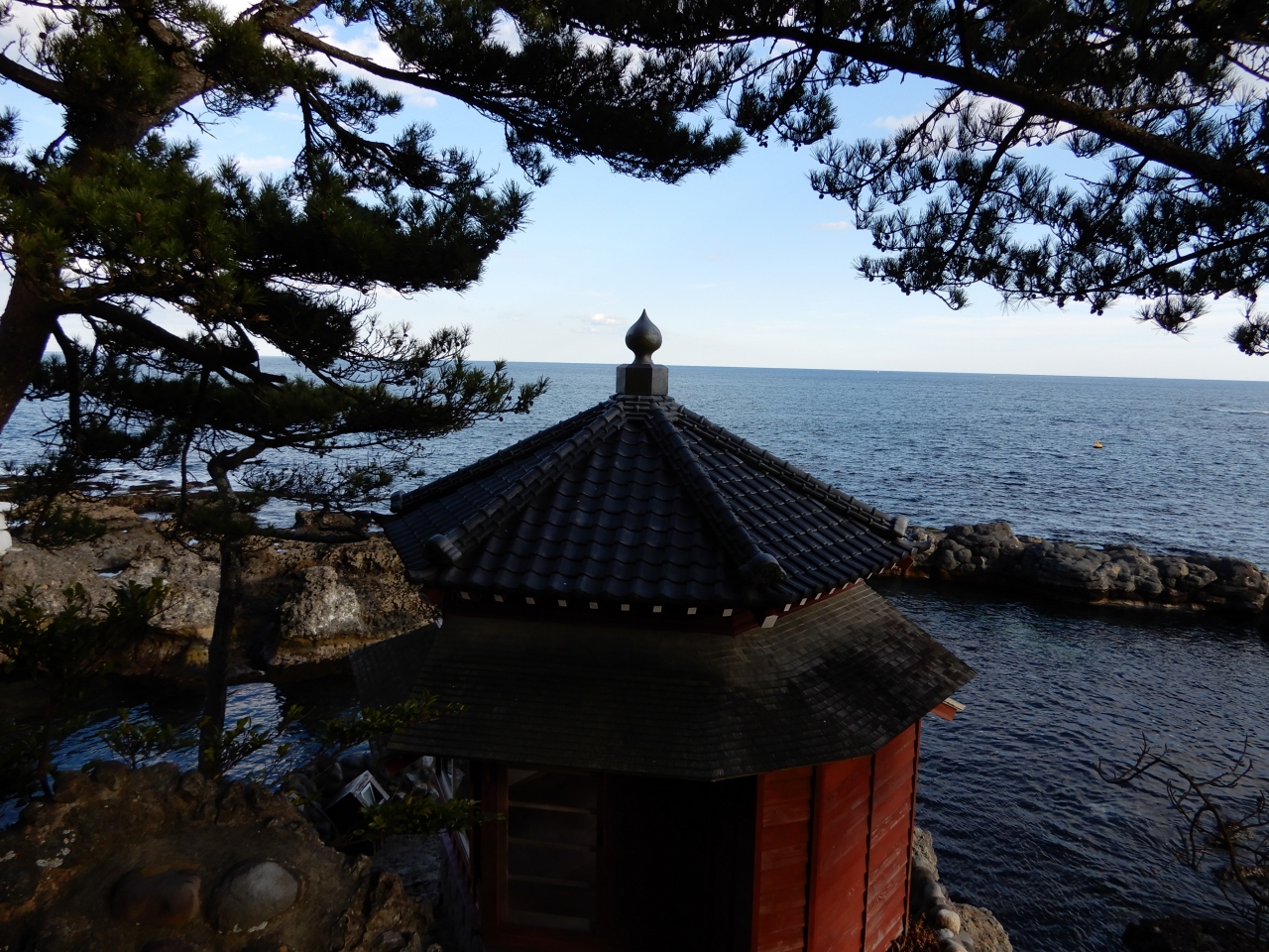 驚いたことに客室にも小さな茶室が付属していました。電気式の炉が切ってあって、茶釜もありましたね。茶道具を持っていけばよかったかな。部屋の窓からは松の木越しに太平洋と六角堂も見えました。