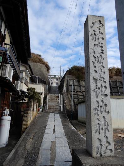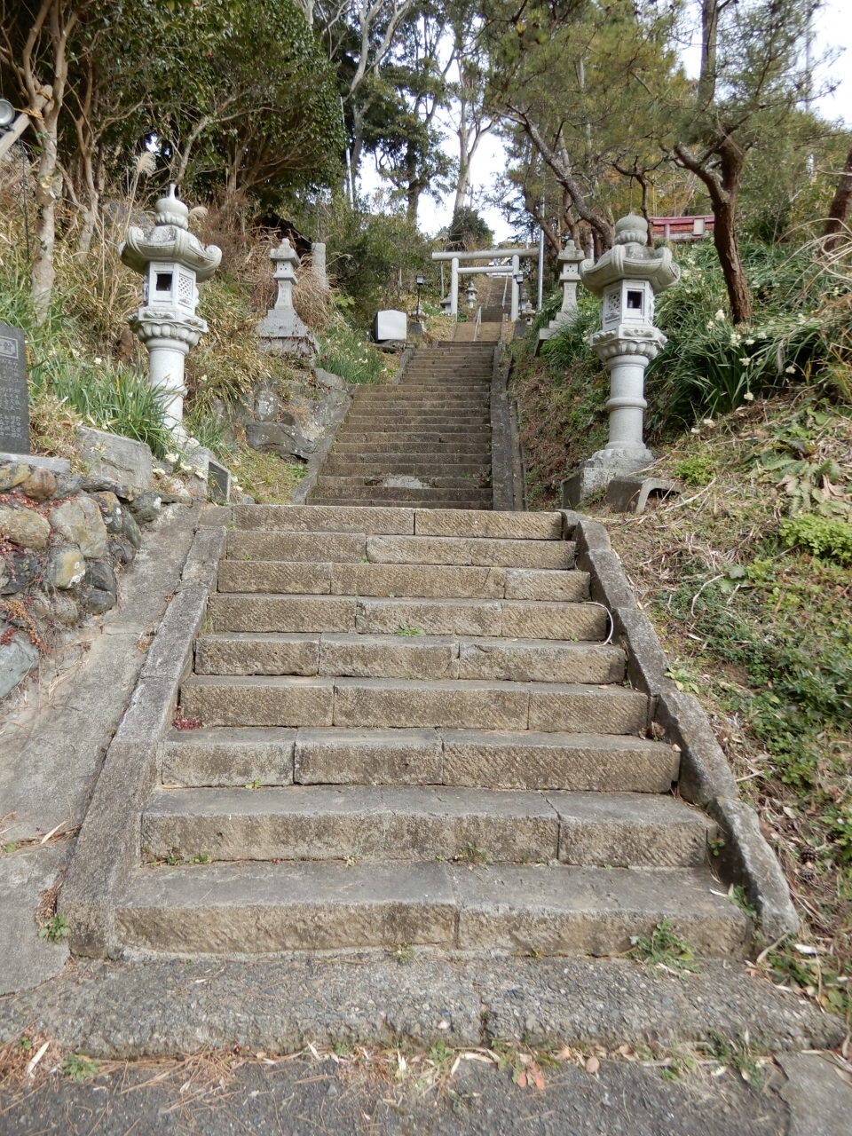 一番下から石段を上がると、最初の鳥居があります。しかし、周りを見渡しても神社がありません・神社はここから左へ細い道を歩いてしばらく先になります。車がやっと一台通れる幅の狭い道が行き止まりになると、そこからまた長い石段です。