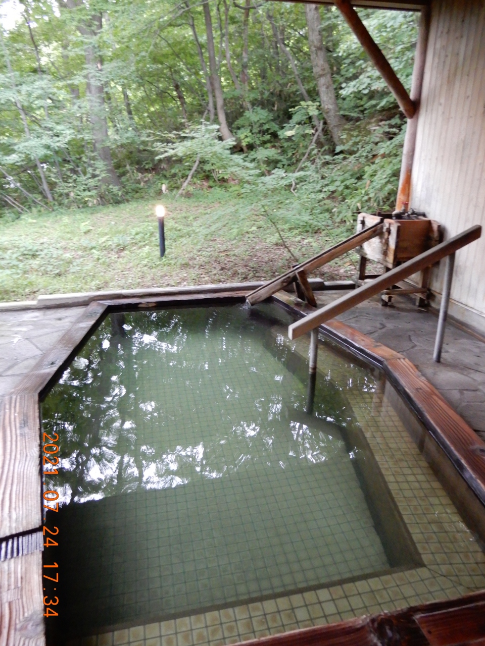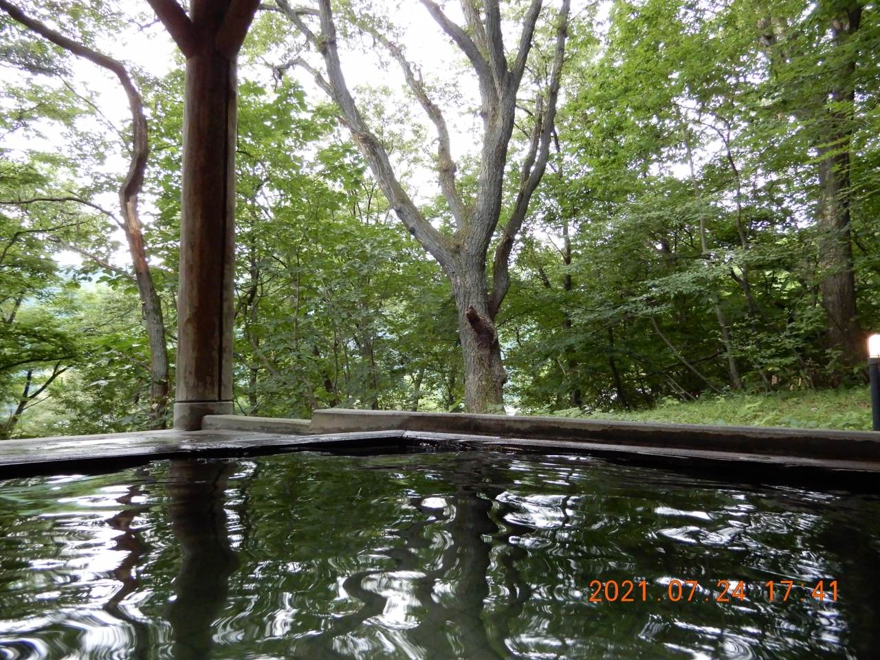 風呂は、見晴らしの良い露天風呂が特徴です。初日は丁度良い湯量・温度でしたが、翌朝は湯量が低く設定されており寝湯状態で、しかも温度も低めで温まりませんでした。これは残念。- 旅行時期