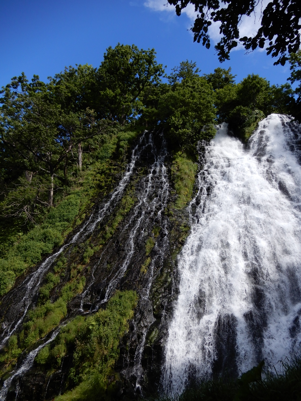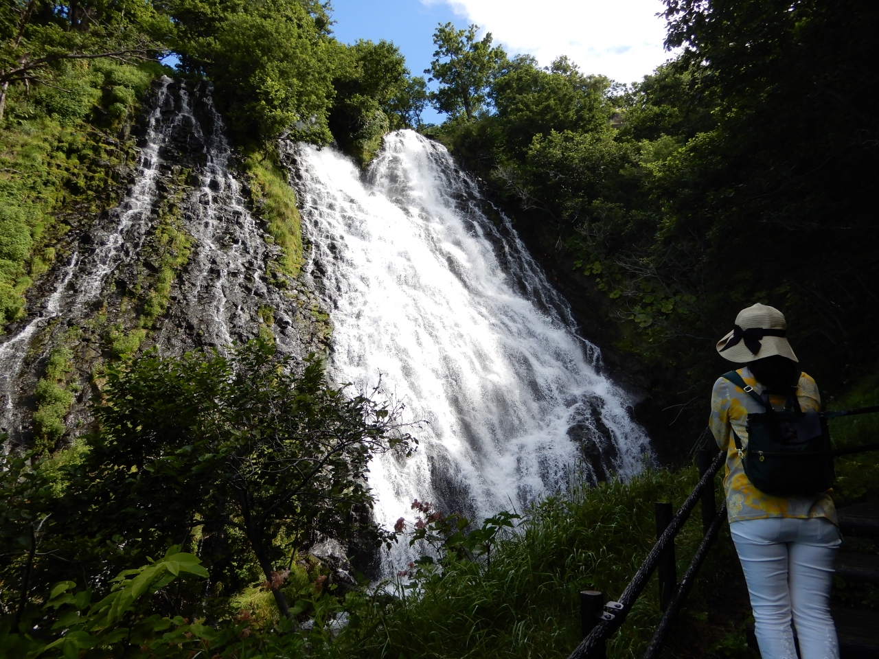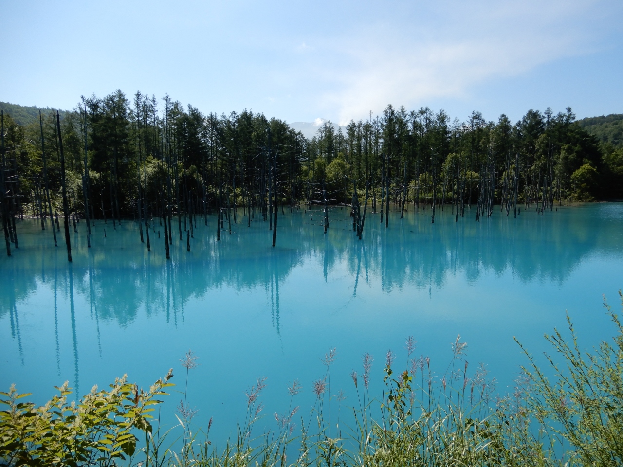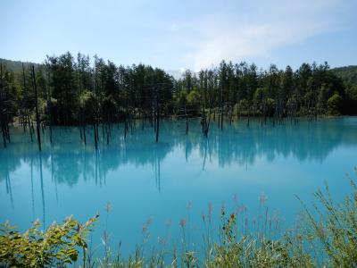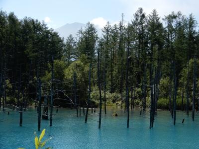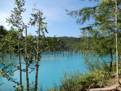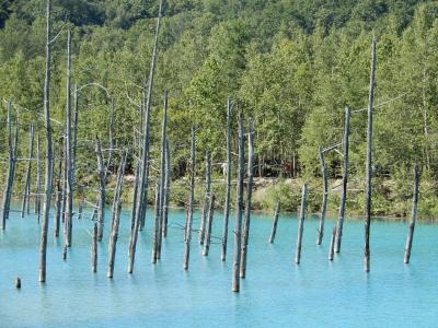 美瑛の宿で朝食を済ませてすぐに向かいました。20分かからずに到着。9時前だったので駐車場はまだ十分余裕がありました。足場の良くない小道を歩いていくとすぐに右側に青い池が見えてきます。撮影スポットは多いですが、噴煙を上げる十勝岳がバックに入るところもありますよ。一番奥まで行くと川が流れていますが、この水も青いので見てみましょう。青い物質が混ざっているので青いのでしょうね。 青森県の十二湖の青池の青さの方が深い藍色で神秘的だと思います。 でも、ここの方が面積が圧倒的に広いので見ごたえはありますね。