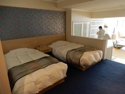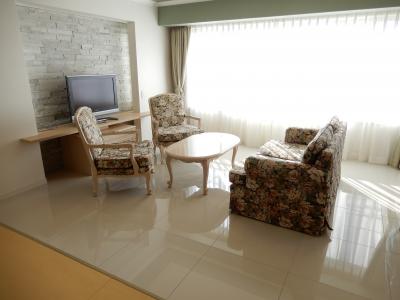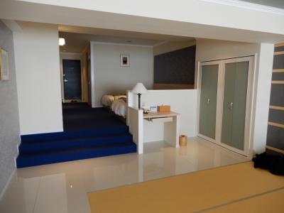 びっくりするくらいの広い部屋! 床のタイルがピッカピカ! ツインのベッドルームの向こうに20畳くらいの部屋、タイルで囲まれた畳は10畳あります。 その向こうにゆったりとしたリビングルームが連続していました。