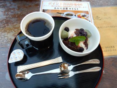 食後に黒蜜きなこバニラアイス(セット324円)、白玉しるこ302円、JAFの会員証提示でコーヒー無料でつけていただきました。