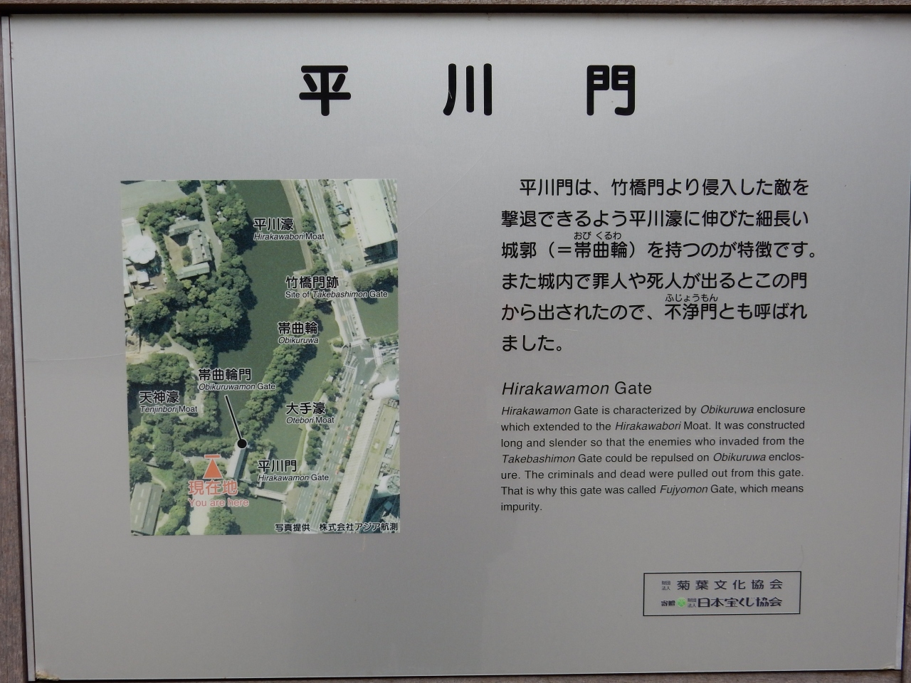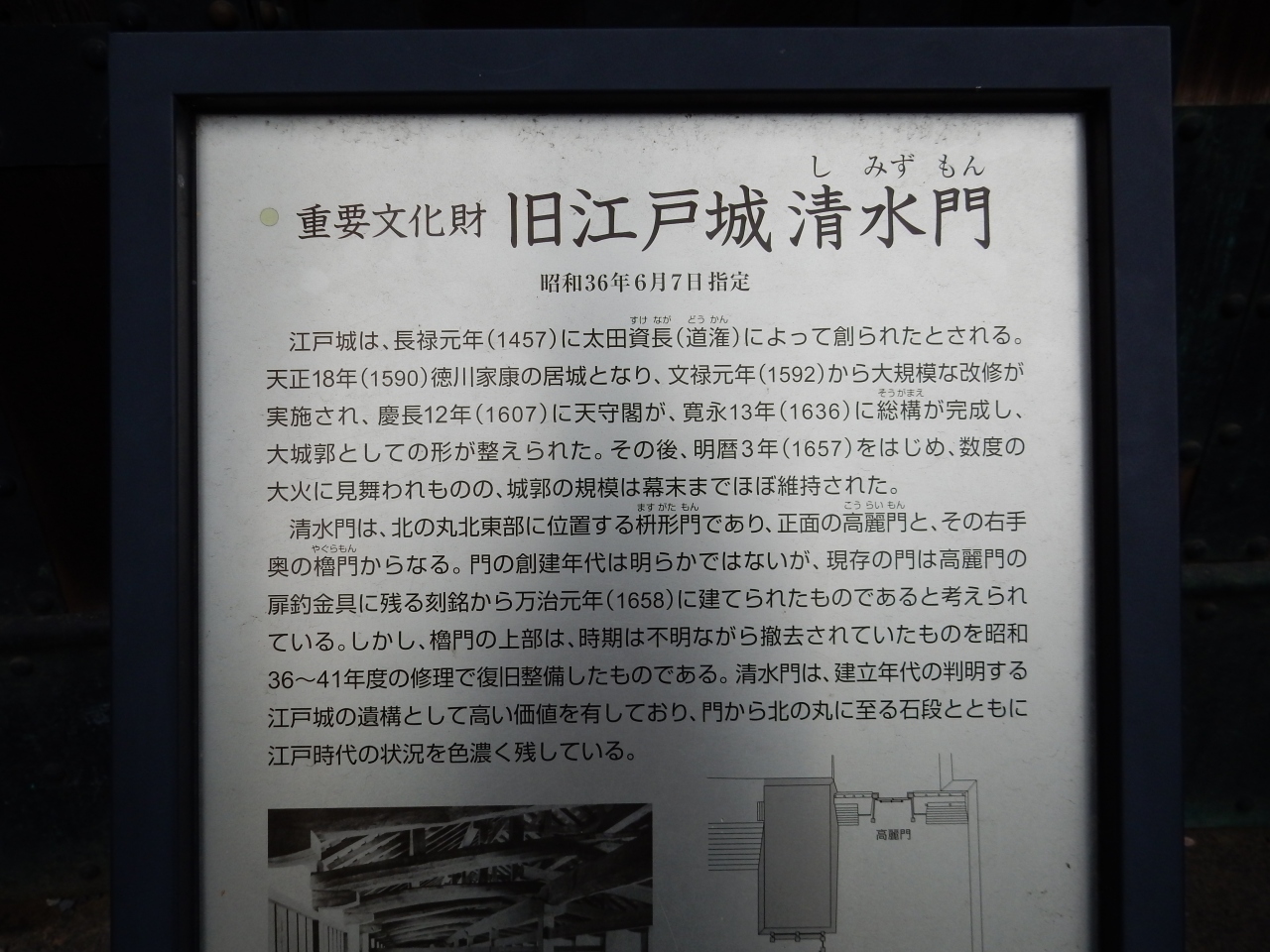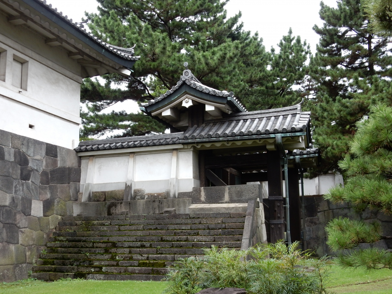江戸城北の丸東北に位置する門です。 正面の高麗門を入ると右に櫓門があり、左は濠で小さな枡形を形成しています。北の丸から見下ろす写真でその枡形の構造が良く分かります。高麗門は小規模で、左右の土塀も短く防御力は高くありません。しかし高麗門を破って枡形に入っても、櫓門に向かえば後左上方から射撃を受けます。枡形が狭いので、いざ門を開いて押し出せば、敵兵は濠に落とされることになります。よく考えられた構造だと思います。