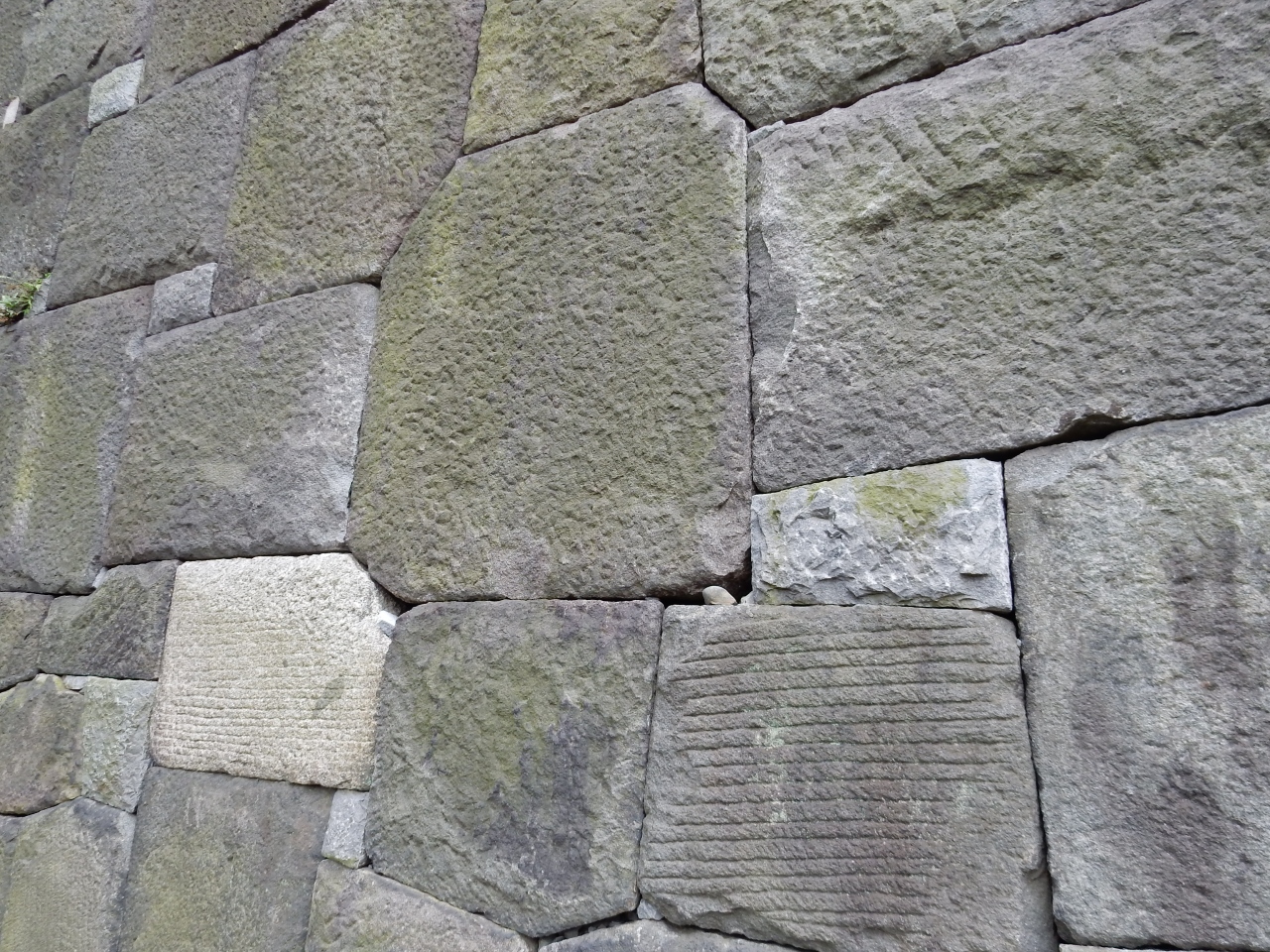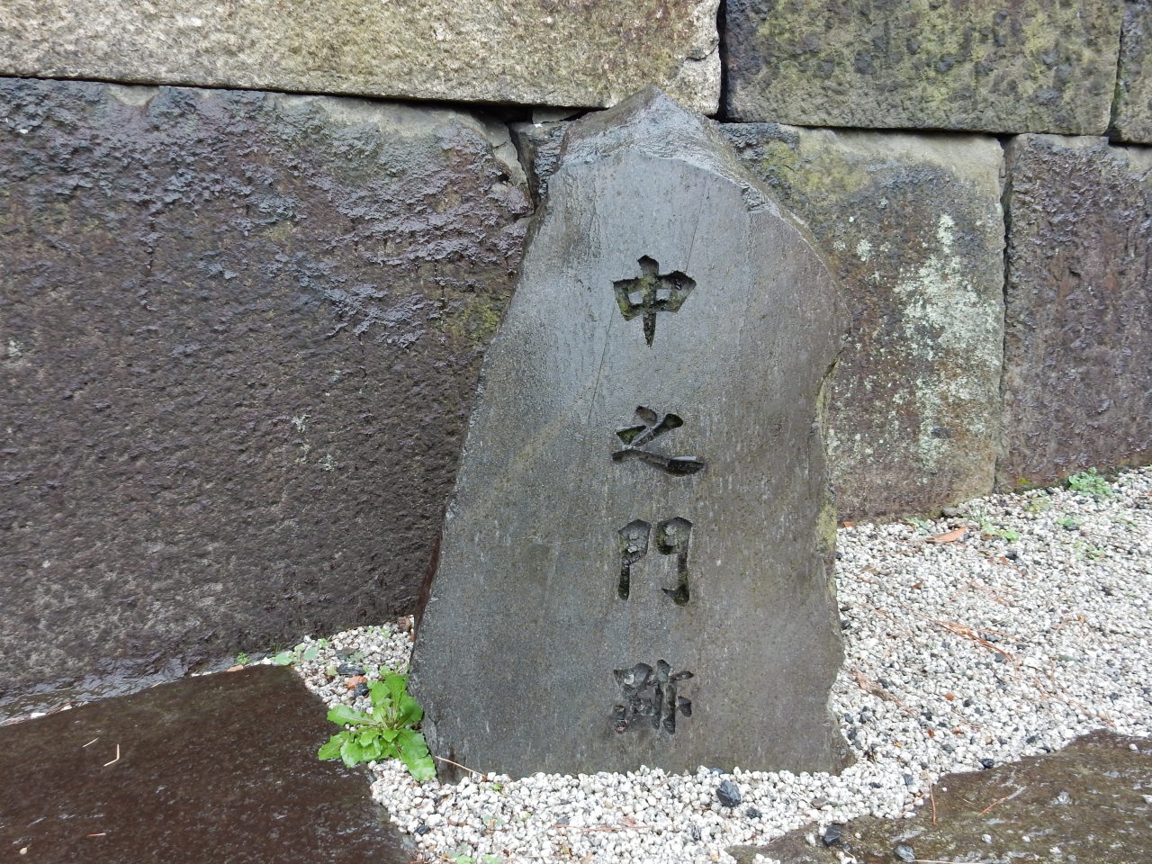 中之門から急坂を登り、本丸への最後の関門、中雀門に達します。門の石垣は、火災の名残と思われる変形があります。門柱を支えた円形の窪みが礎石に残っています。