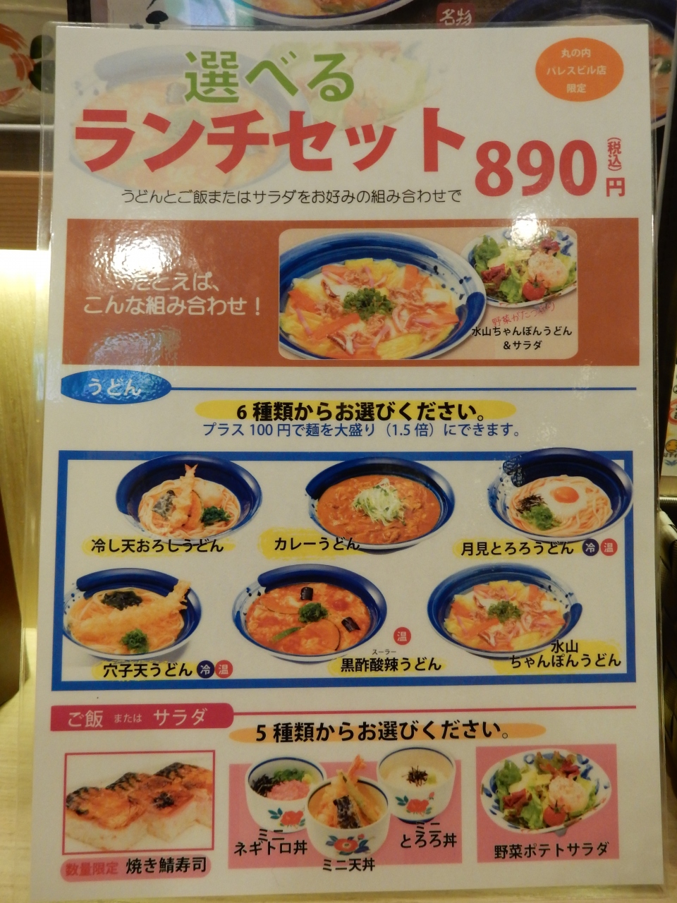 江戸城登城のため、千代田線で大手町駅を下車。ちょうど昼頃なので、大手町近辺には高い店しかないかなと思いつつ大手門至近の出口に向かっていたら、おっと!うどん屋さんがあるではありませんか。 ここで軽く済まそうと思って入りました。満席なので、7分ほど待って入店。ちゃんぽんうどんがお勧めとかで、これを注文。混んでいるせいか20分ほど待ちました。出てきたうどんは、さっぱり塩味風、ラーメンのちゃんぽんのように白濁したスープではありません。具は確かにちゃんぽん風ですね。讃岐うどんほどの腰は無いけれど、程よい硬さの麺はGOODです。なかなか美味しいウドンでした。
