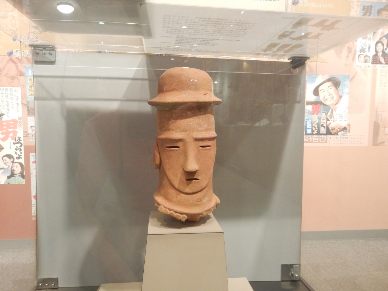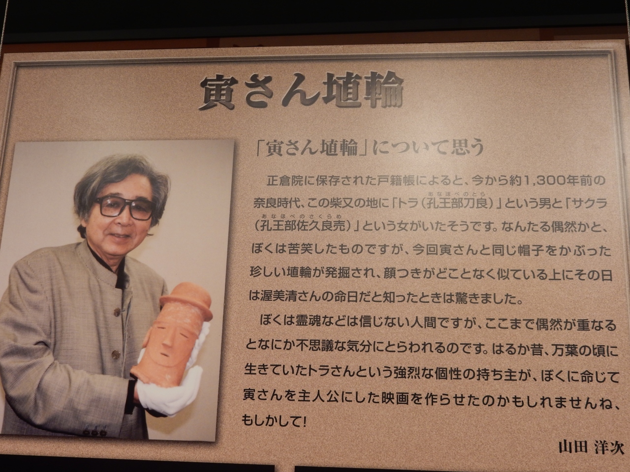 寅さんの命日に、この辺りで発掘された「帽子をかぶった埴輪(複製)」の展示もあります。古墳時代、この辺りに「トラ」という男と「サクラ」という女性がいたという記録も面白いですね。
