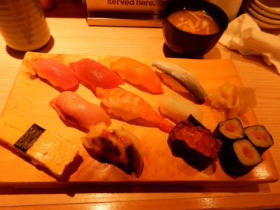 旅行帰り、羽田空港のレストラン街が混んでいたので、モノレールに乗り浜松町駅ナカ(改札の外)にあるこのお寿司屋さんに入りました。お勧め11カン盛りが1300円? ほかのメニューは5カン1000円とか、高いものはたくさんあるのですが、敢えてこの11カン1300円を頼んでみました! 結果、美味しい! 味噌汁も付いてこの値段は安いです。