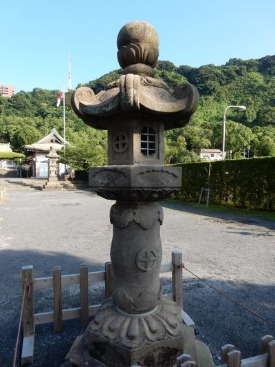照国通りという道が照国神社前まで伸びています。広い道です。この先に大きな鳥居があり、その奥に照国神社があります。島津の「丸に十の字」の紋が入る石灯籠が迎えてくれます。