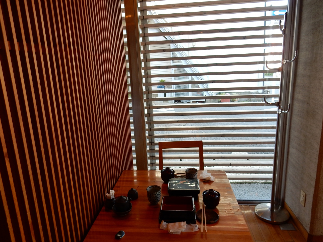 駐車場からのアプローチも料亭のような雰囲気、内部の廊下もそんな雰囲気です。個室ではありませんでしたが、十分な広さと余裕のある部屋からは、窓越しに整備された庭が見えます。とても良い和の雰囲気です。