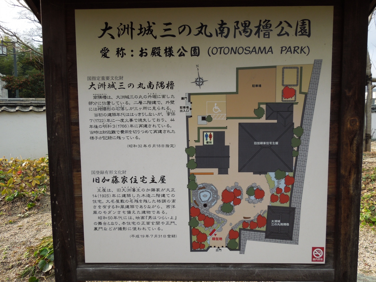 大洲城の南方、町中に三の丸南隅櫓はあります。今は運動場となっている堀底の際に位置します。よく町中にぽつりと残ったものです。どういう経緯で残ったのか知りたいものです。どなたかの家の倉庫として残ったのでしょうか?