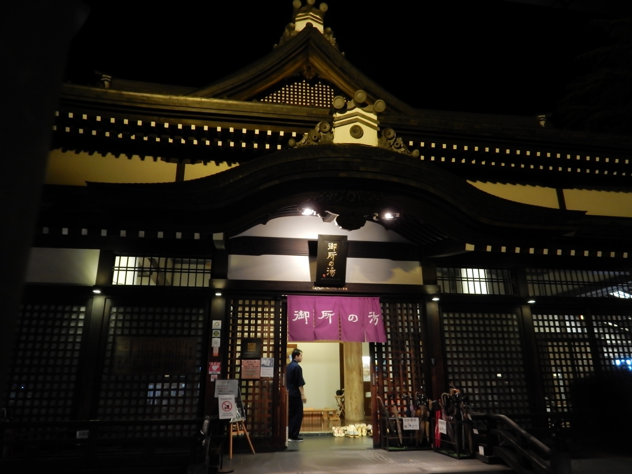 到着後、ひと風呂浴びてから夕食をと思いましたが、早めの夕食で混雑しないうちに外湯めぐりをして、最後の〆に内湯の貸切風呂「天水」というプランを勧められました。 結果、それが大変良かったです。 5時15分からゆっくり食事を楽しんで、それから外湯めぐりに出て、御所の湯、一の湯、柳湯を巡り、宿に戻って一休みしてから貸切風呂天水で大いにくつろぎました。