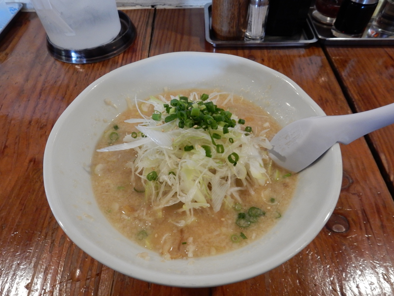 麺の上には白ネギがたっぷり載っています。スープの中に炒めた野菜がたっぷり入っています。麺とともにいただくと白みそのスープと絡んで大変美味しくいただけます。