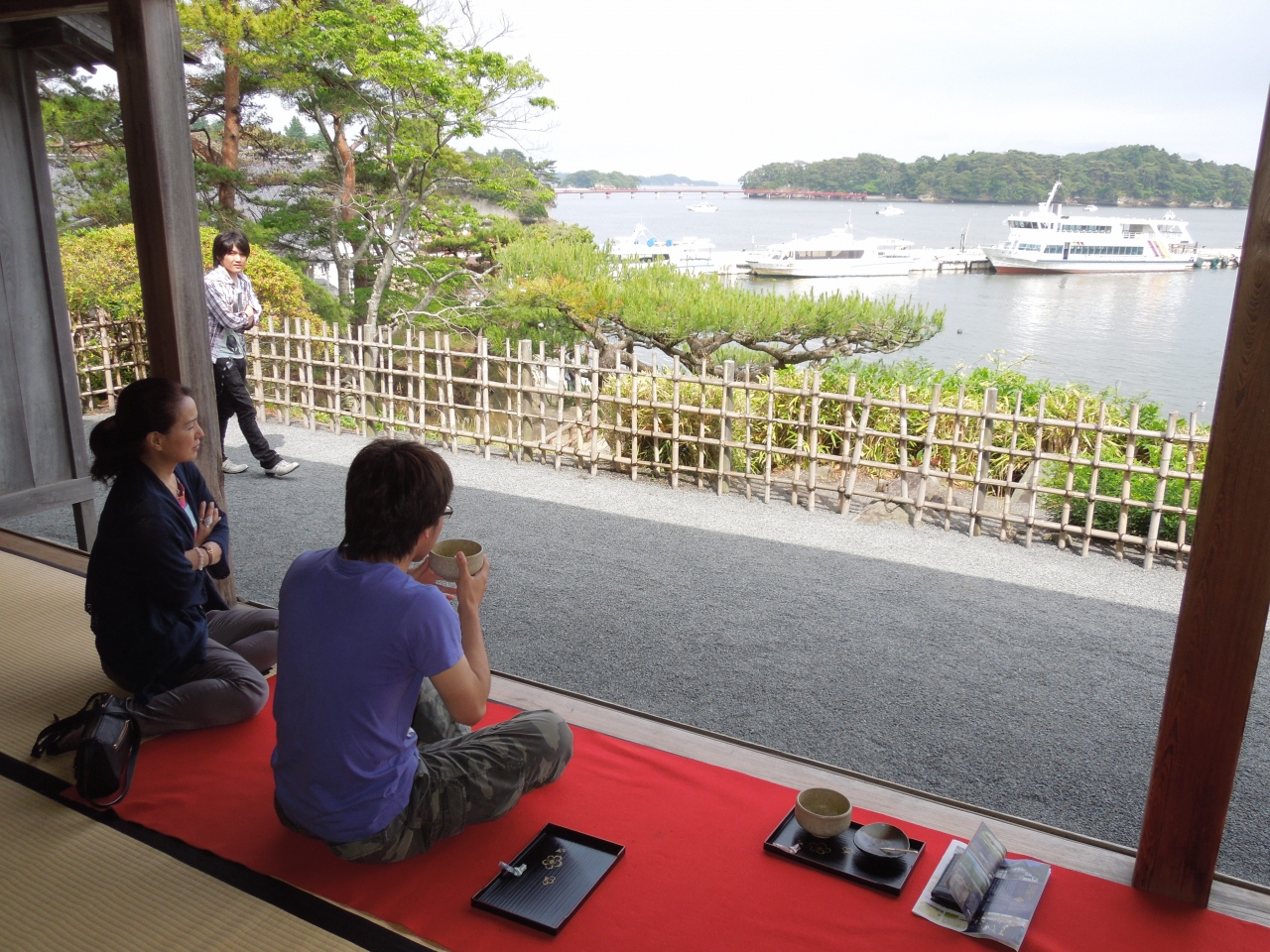 ここからの眺望は、ゆったりした松島の海を堪能できます。名物「ずんだ餅」をいただきながらの抹茶は最高でしたね。息子はのんびり横になっていましたが、混んでいるときは無理かもしれません。また訪れたい場所です。