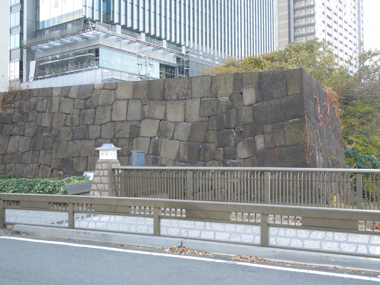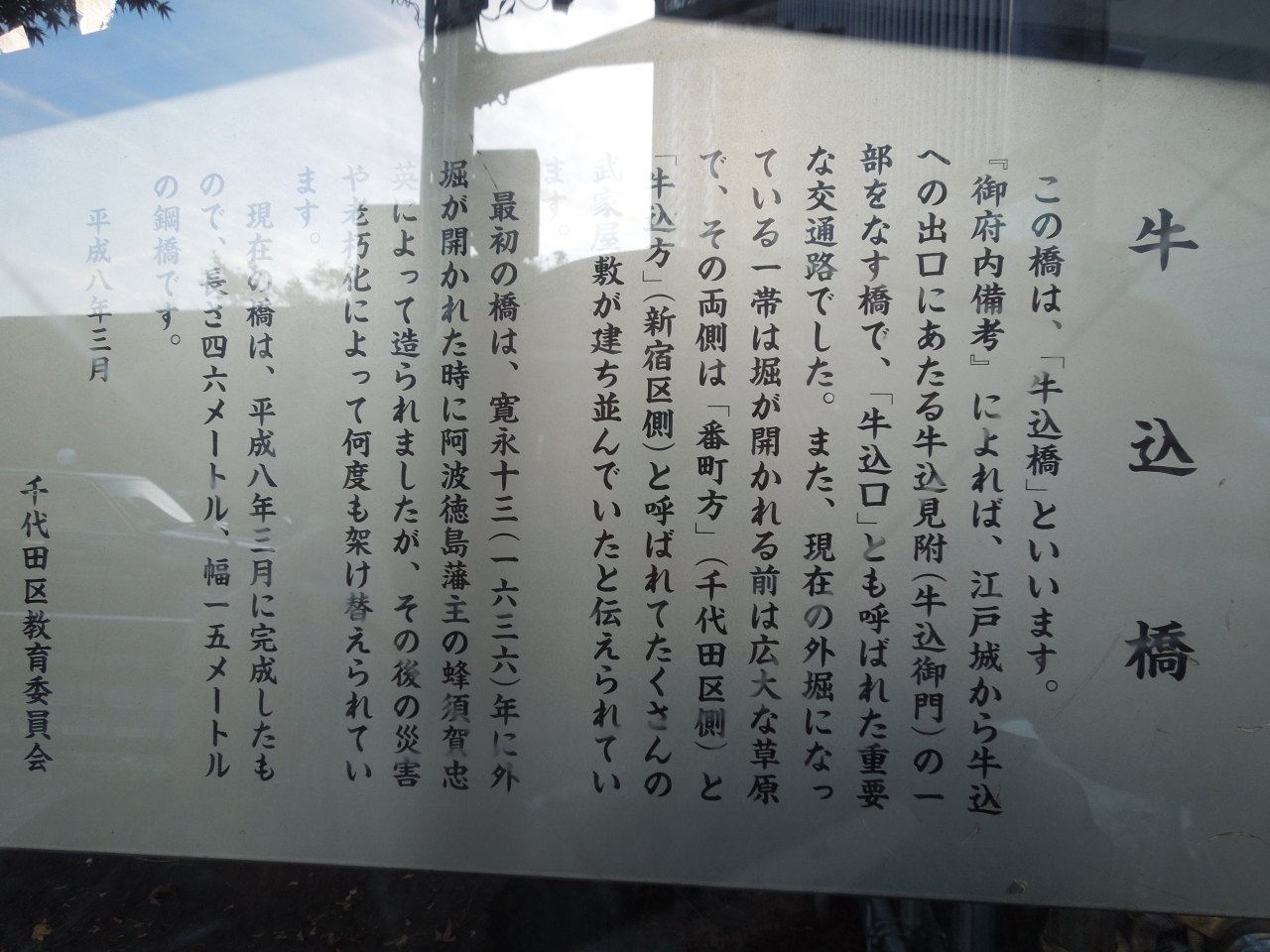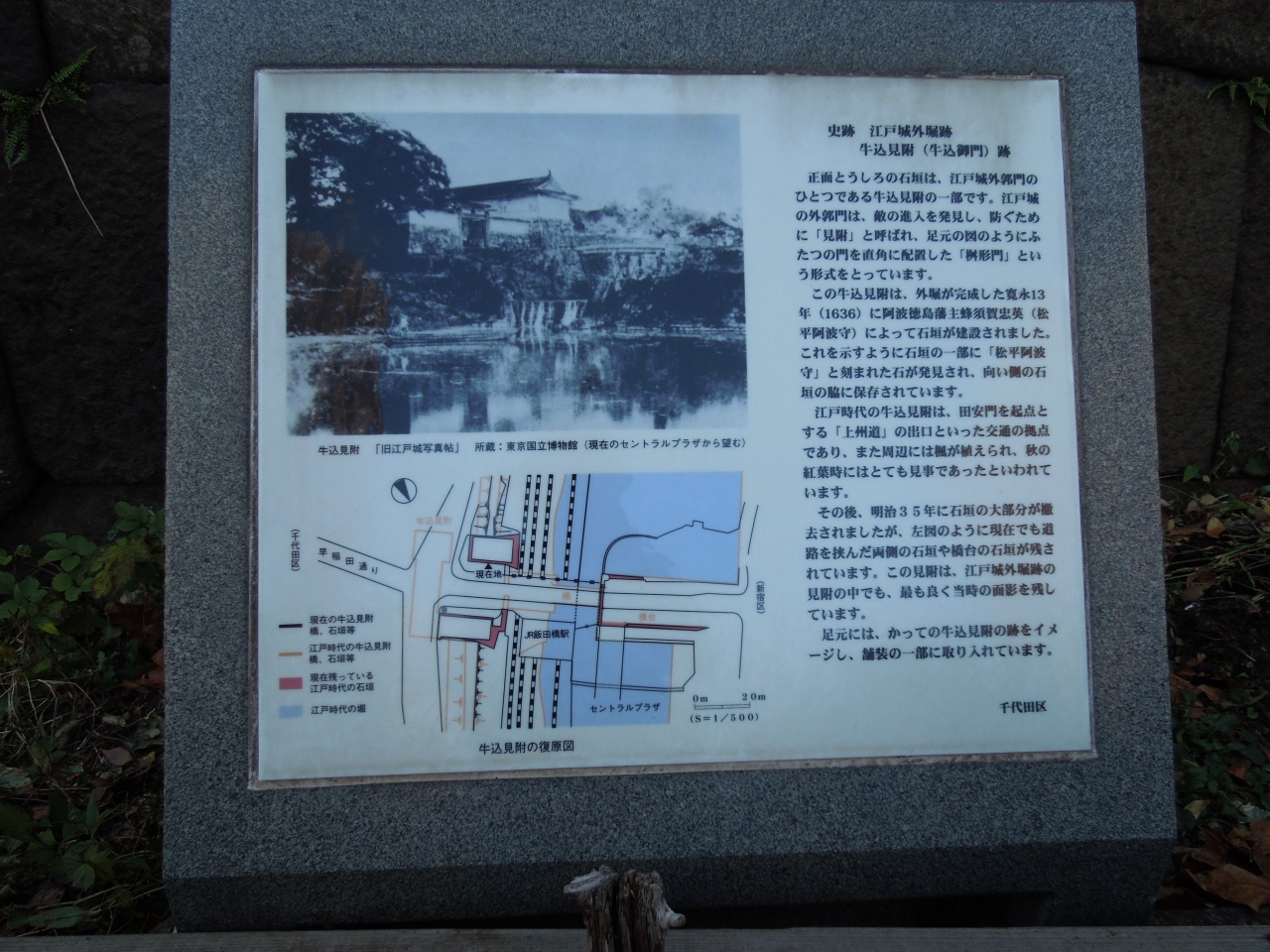 飯田橋駅を西に出たところ、道路の左右にどーんと石垣が聳えています。ここが牛込御門の枡形があったところ。雑草が覆っている部分もあり、なんの手入れもしていないようにも見えます。しかし、よく見ると、かなり立派な石垣です。江戸城本丸、二の丸、三の丸の門跡の石垣よりは石の大きさが小さいようですが、一般的な城の石垣よりも大きな石が使われていると思います。石の大きさは、財力を誇示するものだそうですので、流石に徳川幕府の城ということなのでしょう。この石垣の上に櫓門が載っていたはずで、復元は道路の関係上も不可能ですが、雑草を払って史跡らしく保存していただきたいと思いました。
