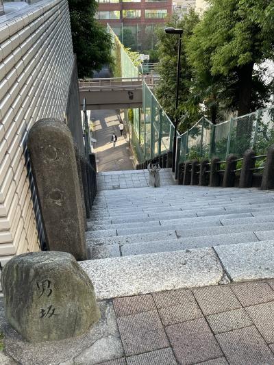 神田駿河台から一気に猿楽町に向かう階段です。断層なのか、高低差がかなりあり、そのせいで段数も中々な数でした。昔は左右に明大付属高校がありましたが、いつの間にか明大の校舎になっていて、見える風景も変わっていました。しかし男坂の石段そのものは数十年変わりなく存在していました。