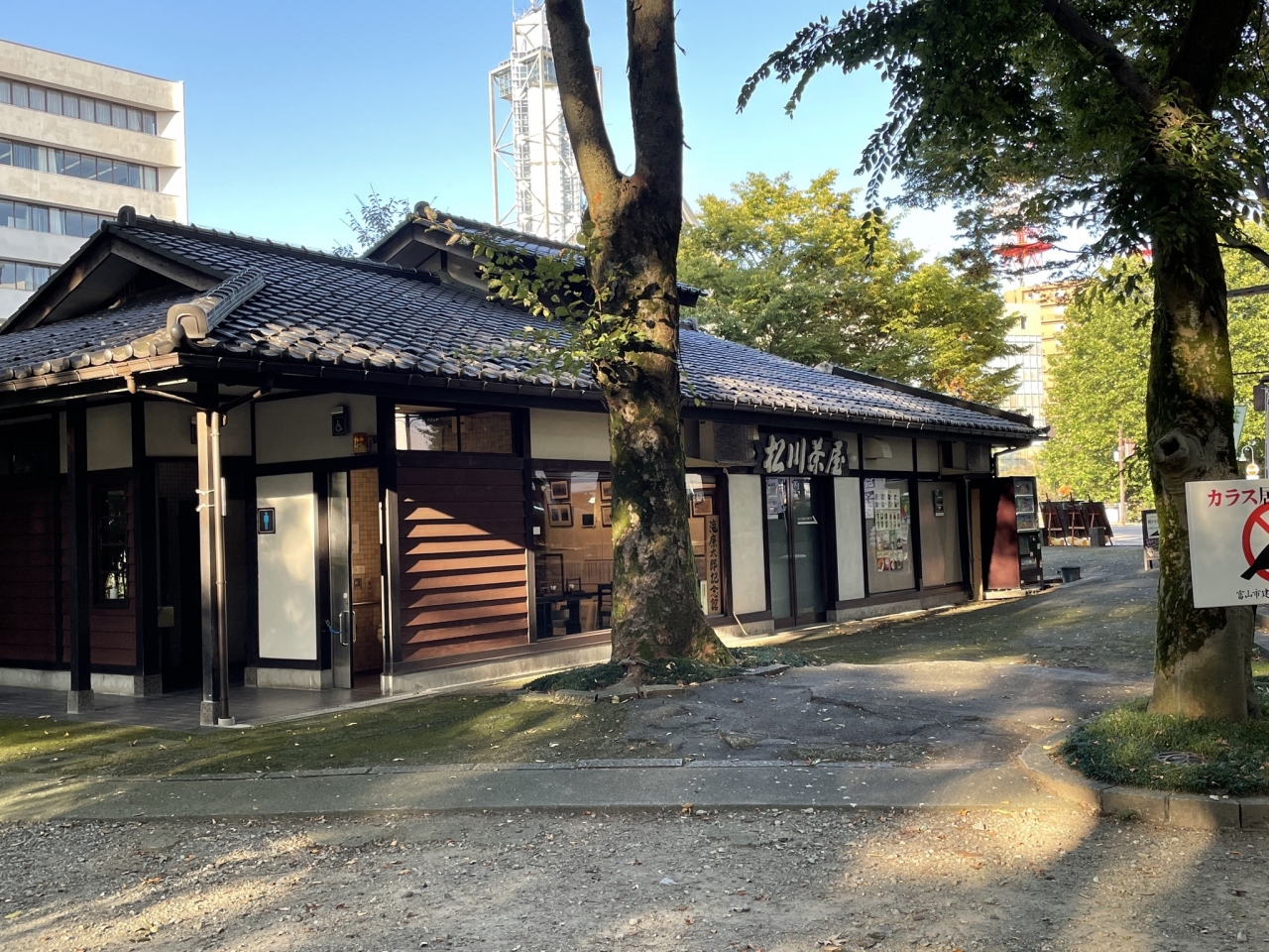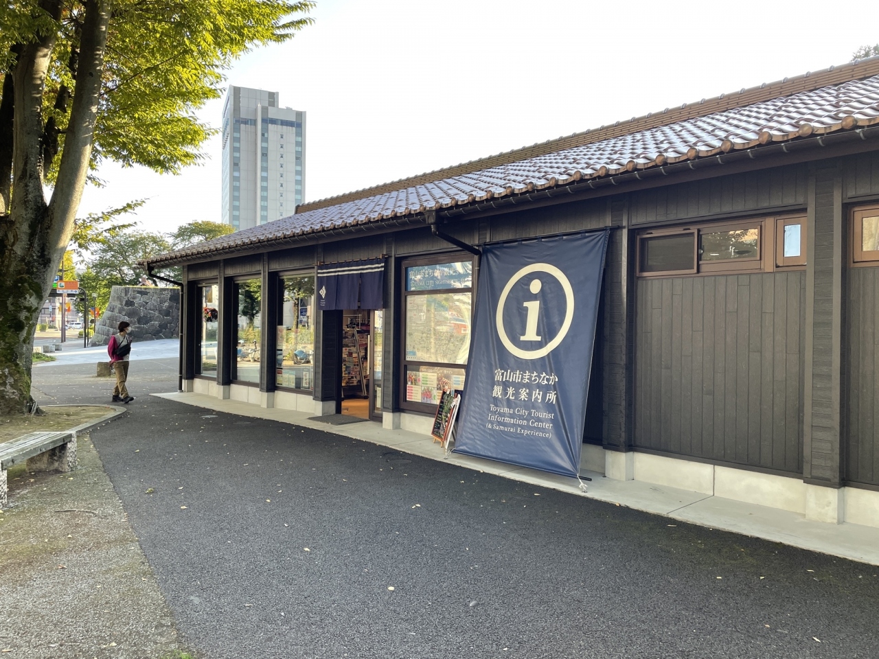 富山城址公園の千歳門前にある案内所です。車で通ると気付かなかったです。案内所には市内観光のほか、郊外の観光施設のパンフレット、いろいろなお土産品なども置いてありました。隣にはなぜかお馬さんがつながれていました。