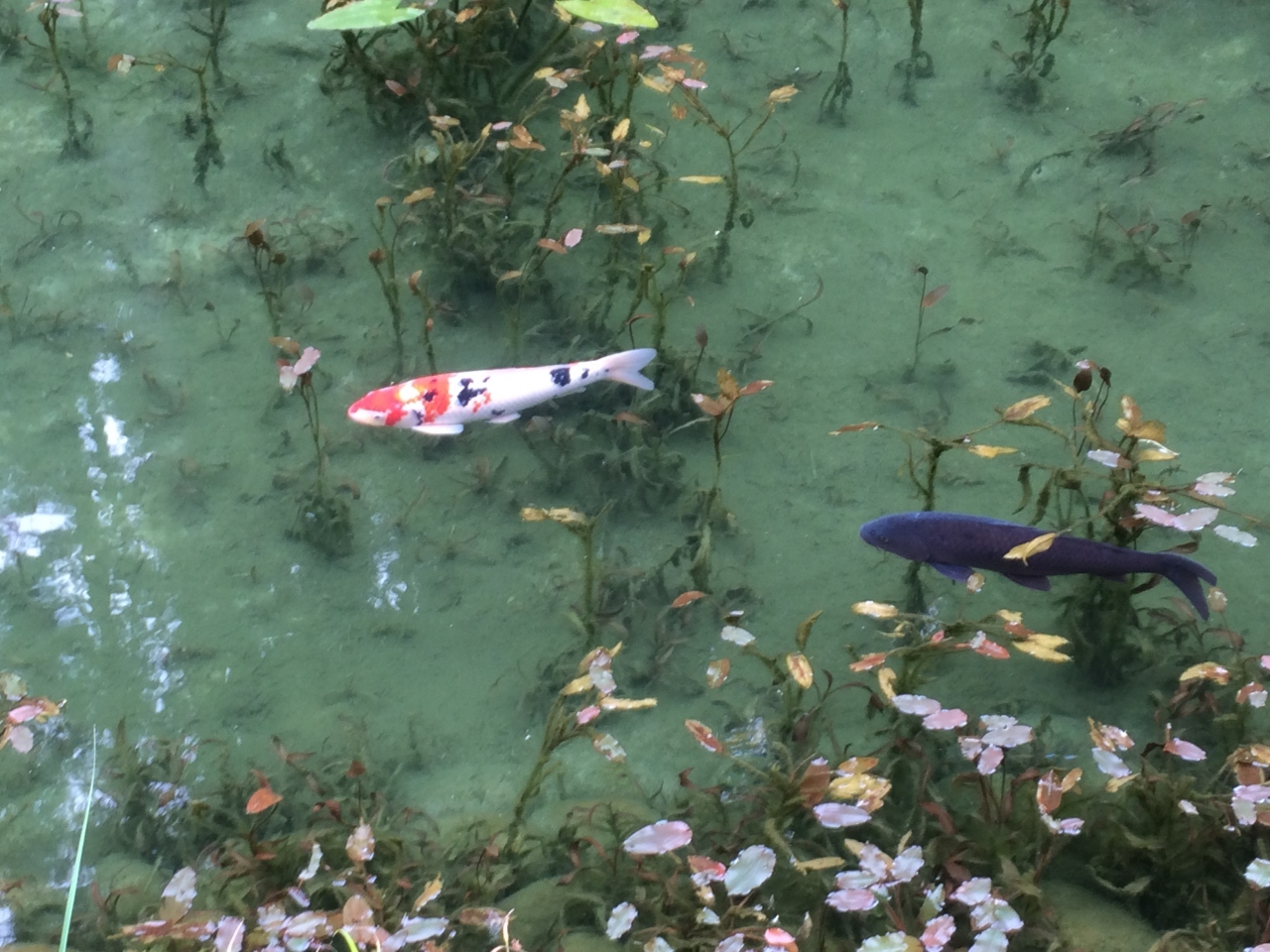 湧き水のせいで蓮の池なのに透明度がある水質でした。肉眼で見る限りよく見る写真の様には見えずに普通の池の様でしたが、スマホのレンズを通してみるとCCDが何かに作用したのか絵に描いた風景画のような景色が見えてきました。モネの池と言われるのもなるほどと感じました。