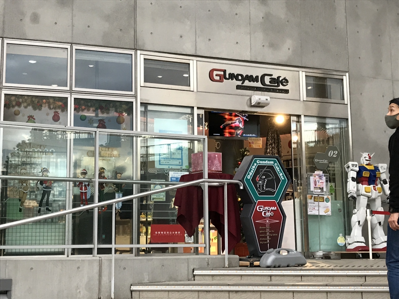 ガンダムの目の前にあるお店でした。所せましに楽しそうなキャラクターグッズが並んでいてお土産選びするとしたら迷う感じです。カフェとなっていますが、基本的にはテイクアウトのお店で、お客さんは店前の大階段でドリンクを楽しんでいました。