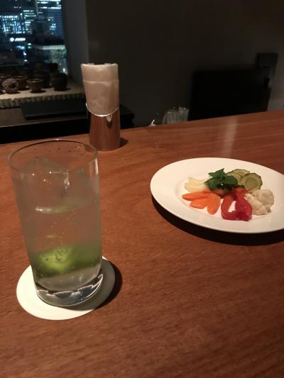 カウンター越しに日比谷公園方面の夜景を眺めながらお酒が楽しめました。大きなカウンターは樹齢600年ものの花梨の樹から作られたそうで、重厚な感じがしました。遅くに行ったせいか、お客は自分たちだけで静かに過ごすことができました。