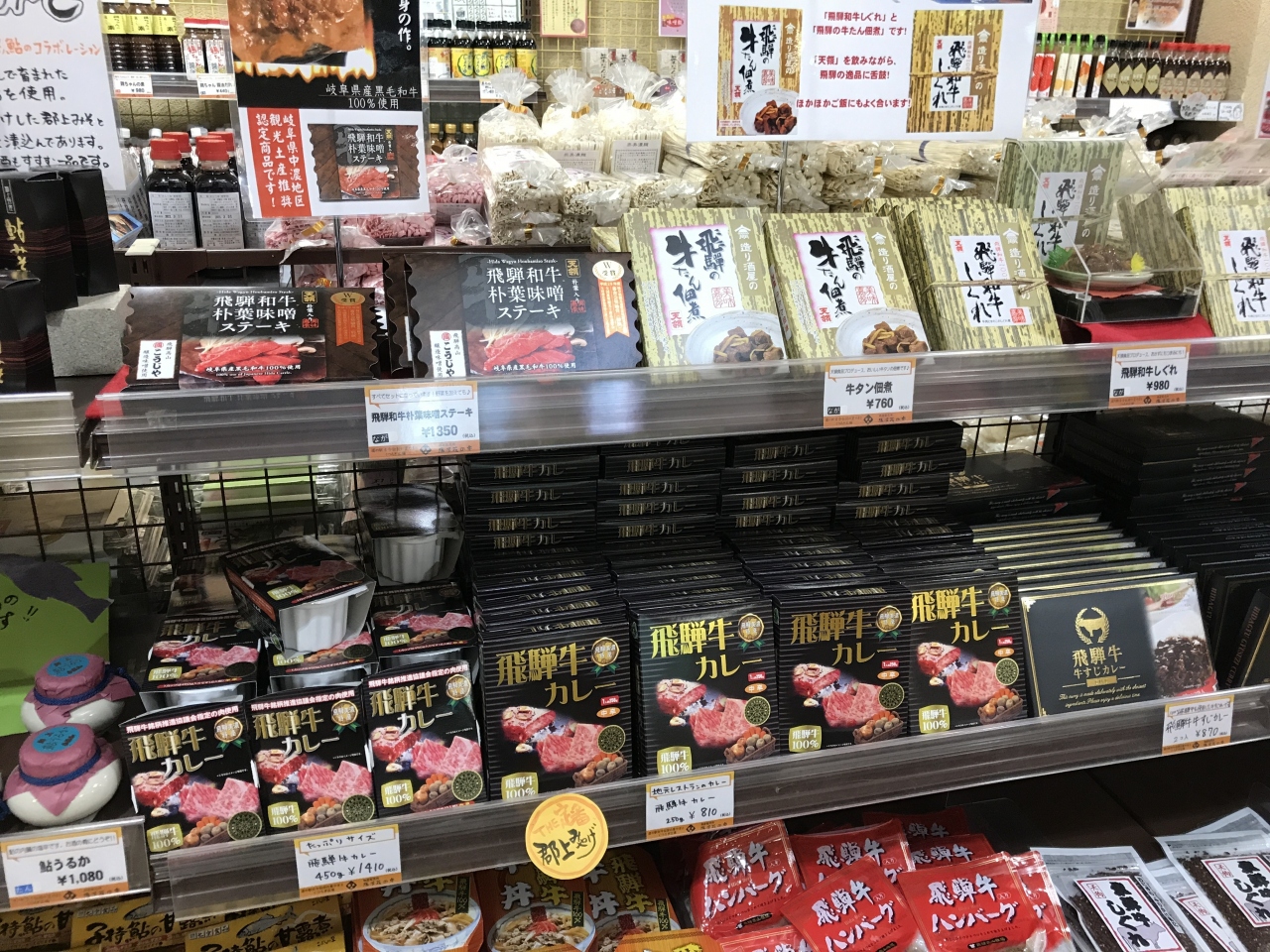 通り道なので何度も訪れていますが、物販コーナーでのお土産品が充実しているので楽しませてもらっています。結構広いスペースに近隣の地場商品が詰め込まれている感じです。飛騨牛の加工品がたくさんあって手軽に飛騨牛を楽しめます。