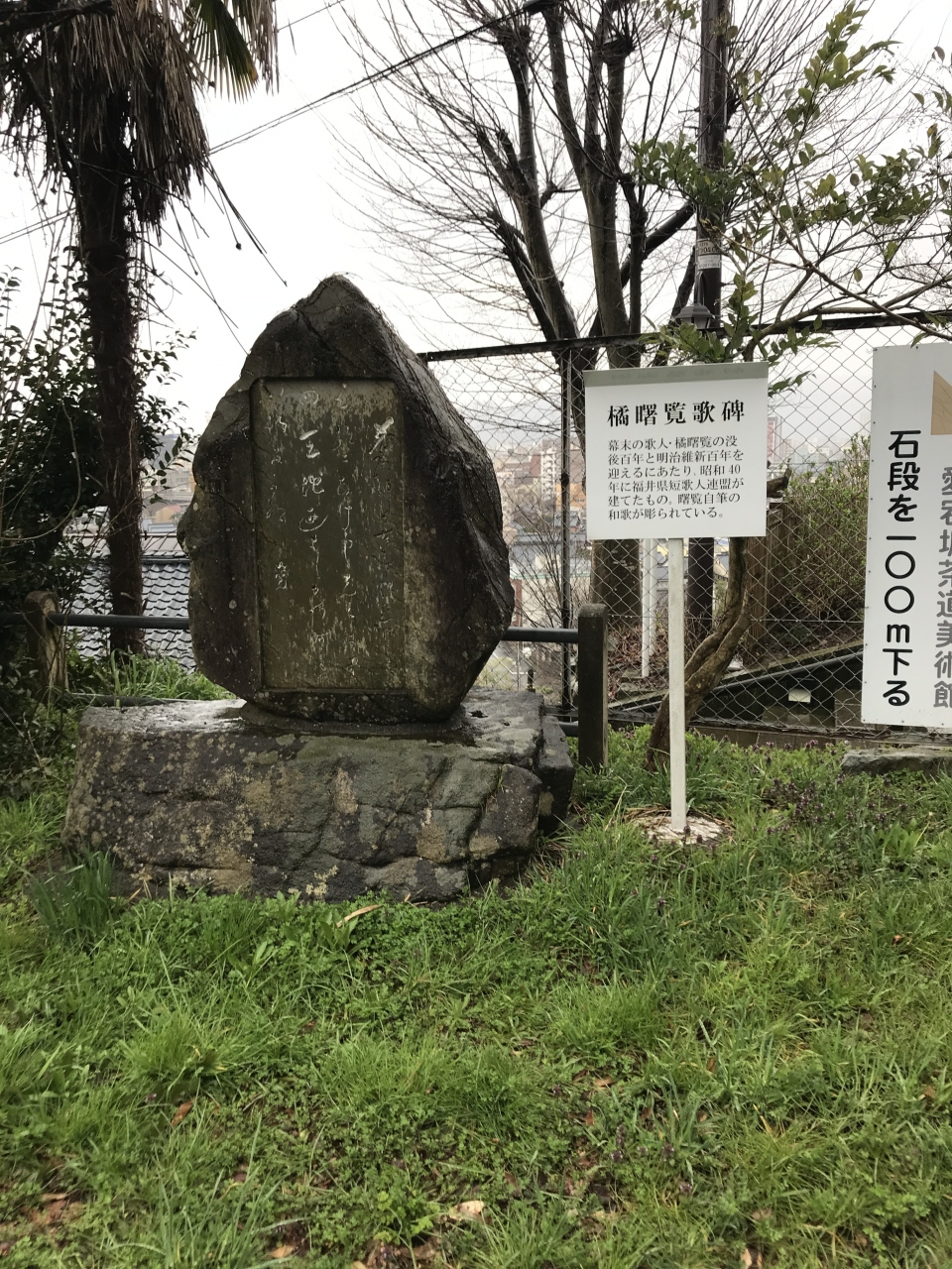 愛宕坂の途中にある文学館を見学した後に、緩い愛宕坂を上り足羽神社へ向かう途中に曙覧の歌碑がありました。文学館もあることから周辺は曙覧の聖地のような感じです。残念ながら雨降っていましたが、天候が良ければ福井市が望める景色の良い場所の様です。