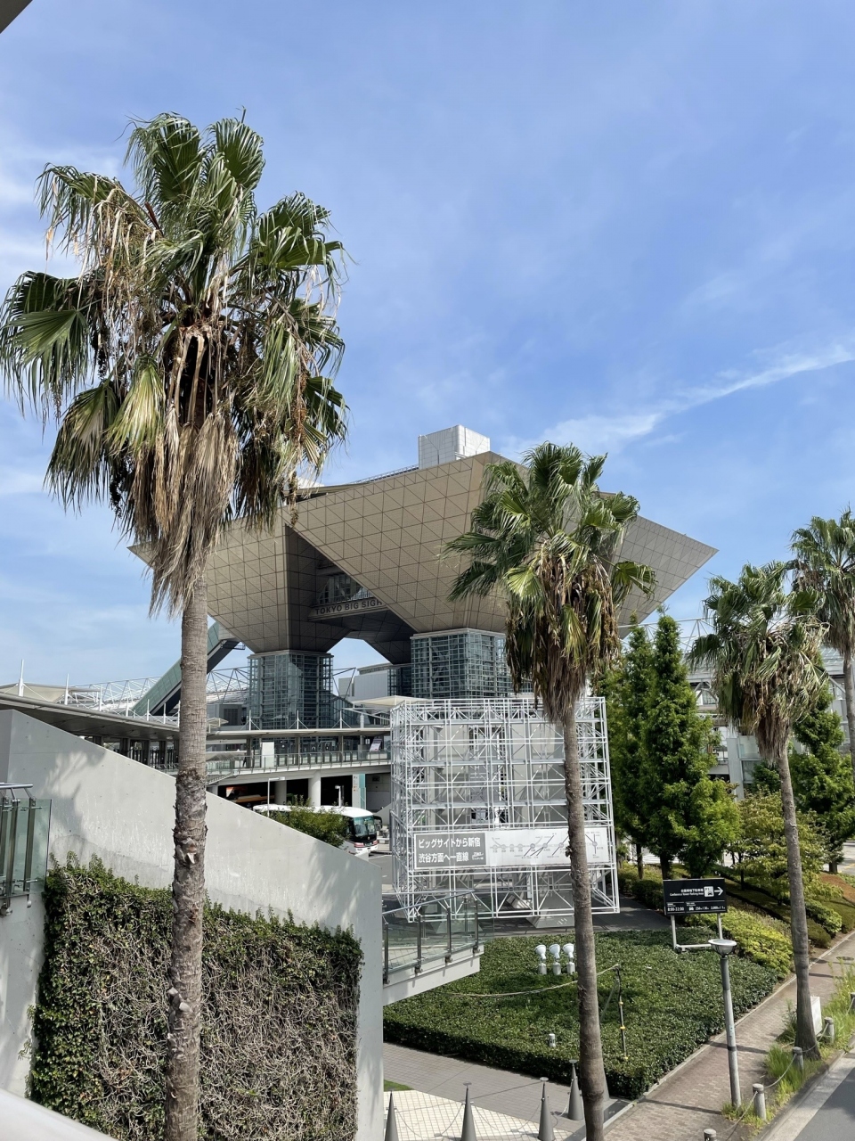 ゆりかもめ駅を降りて展示場に向かう時、ヤシの木越しに施設が見えてきます。この時は7月の暑い時期でしたのでヤシの木越しのビックサイトは異国の建物に見えました。冬はそんな感じはしませんが、真夏に展示場と駅の間は灼熱地獄でした。