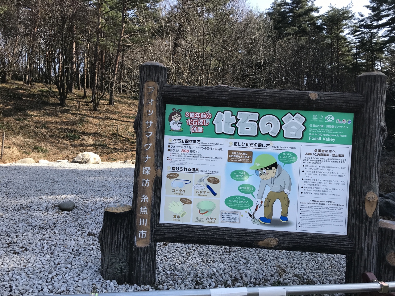 化石の谷はフォッサマグナミュージアムの付属施設だそうです。300円で2時間、ハンマー片手にか先探しが楽しめるそうです。いい大人が一人でやるには恥ずかしくてできませんでしたが家族ずれにはいいイベントになりそうでした。