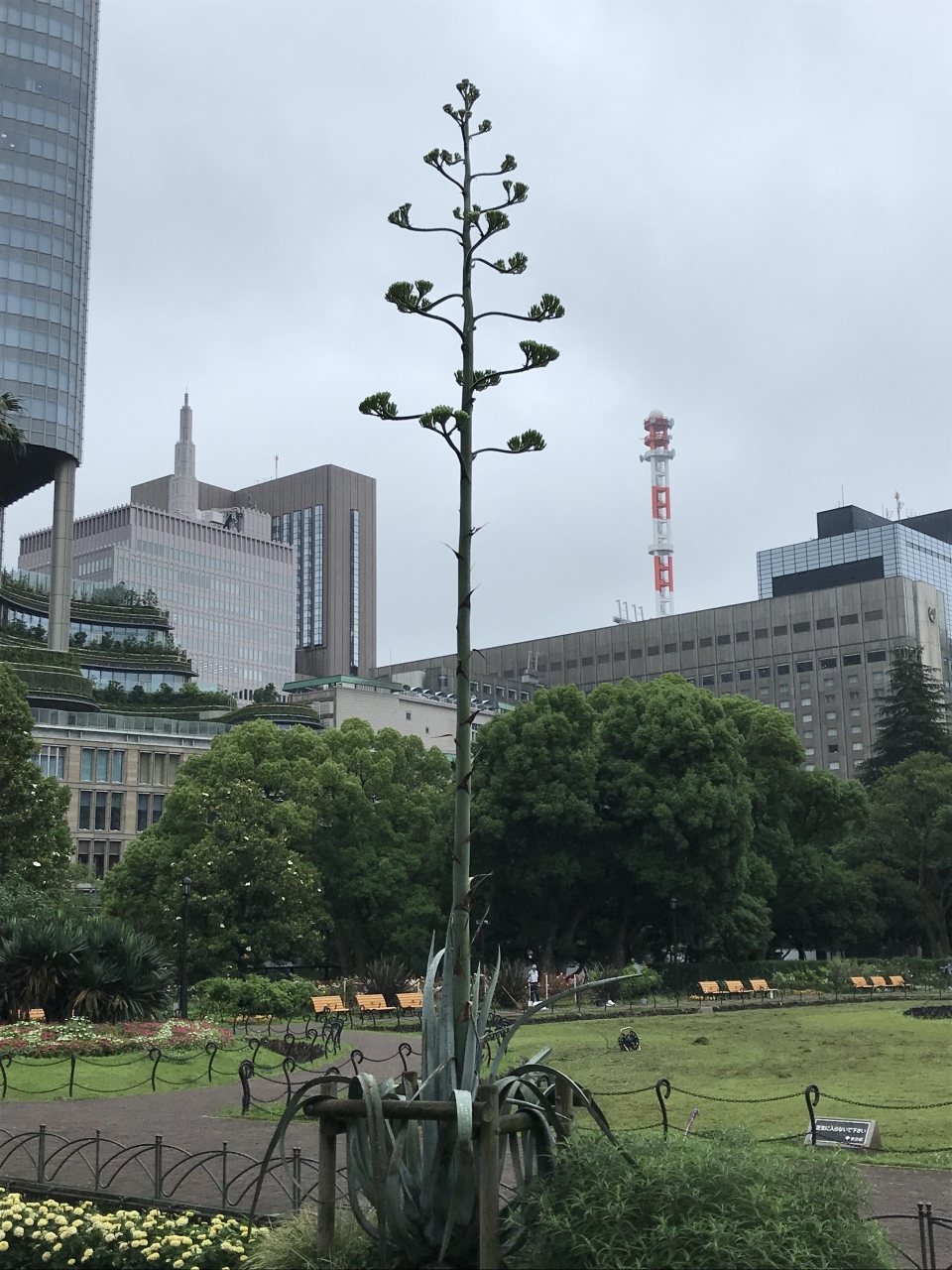 天気の良かった日比谷公園を散歩中、前日にテレビで地方の公園の多肉植物が、数十年ぶりに開花したニュースを見かけましたが、同じ植物が第一花壇に存在しました。残念ながら開花一歩手前でしたが、珍しい植物に出会うことができました。名前は難しくて思い出せませんでした。