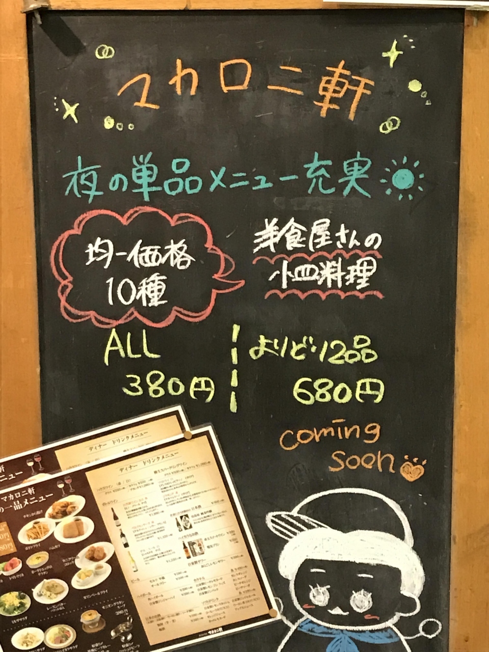 マカロニと名前がついてますが、パスタ以外もたくさんある洋食屋さんです。ハンバーグが美味しかった印象がありますが、カレーを注文するお客さんが多かったです。なぜかランチ時間帯に夜のメニュー案内が手書きで表示されていました。