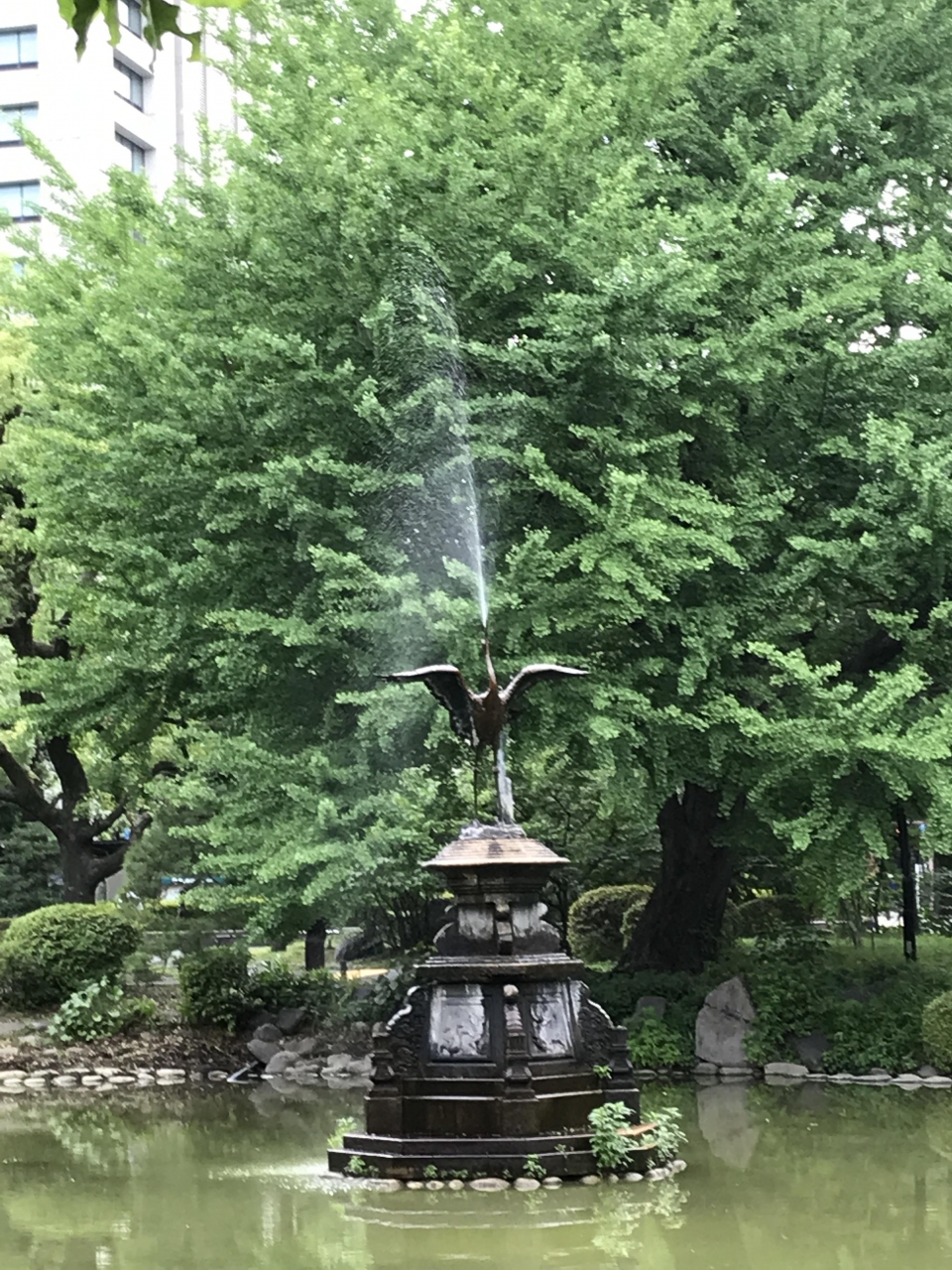 日比谷公園に2つある池の一つです。初夏の新緑に囲まれた池はとても癒されました。ベンチも周辺に数多く配置され、平日のお昼休みは周辺の会社の方が佇みに来るようです。日比谷公園は洋風のイメージがありましたが、この周辺は完全に和の庭園でした。