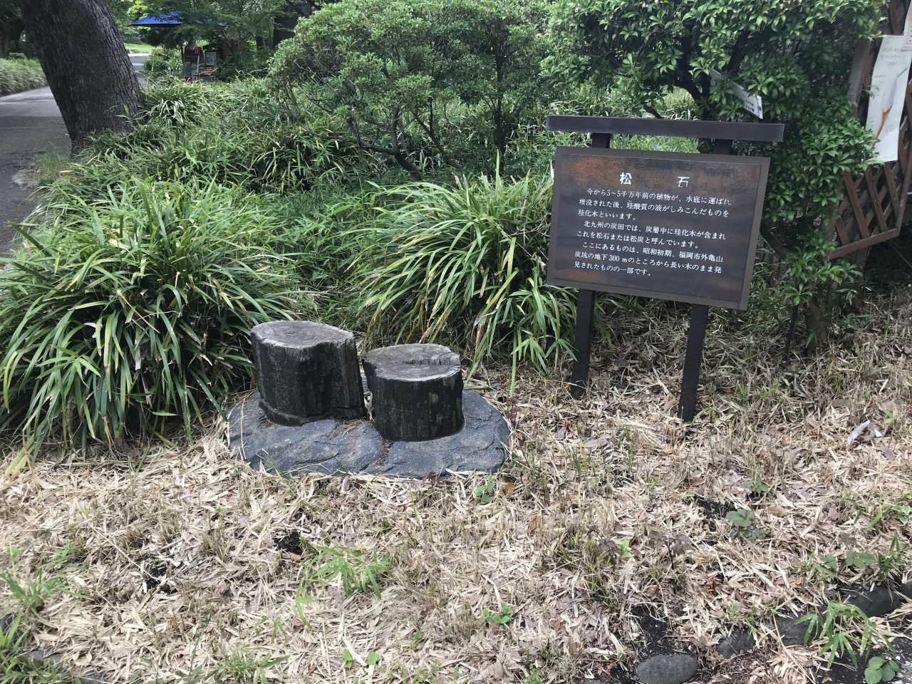 最初はコンクリートでできた置物のような感触でした。九州で見つかった松の化石だそうですが、雨ざらしで大丈夫なのでしょうか。ちょっと心配になる展示のされ方です。花壇の隣にさりげなく配置されていたので偶然見つけることができました。