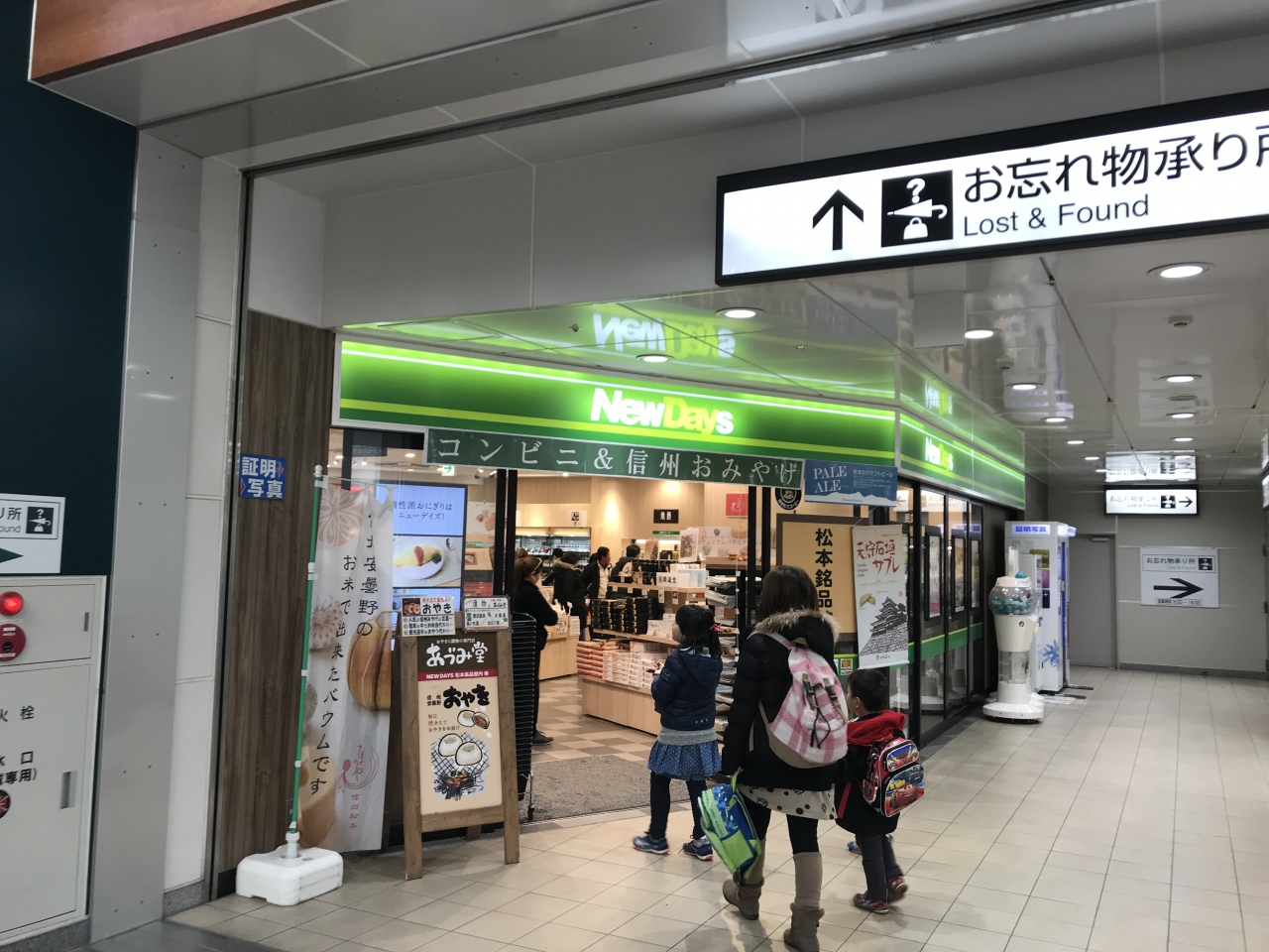 松本駅、駅ビル内の3階。コンビニの外観ですが、少し奥に入るとほぼお土産品だらけでした。レジはいつも3か所フル回転なほど、大人気の主背の様です。買い忘れたお土産品もここがあるから安心でした。改札近くなのでギリギリまで利用できそうです。
