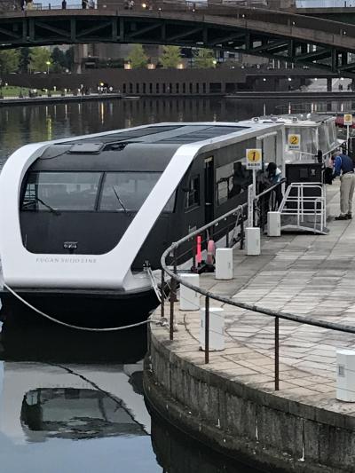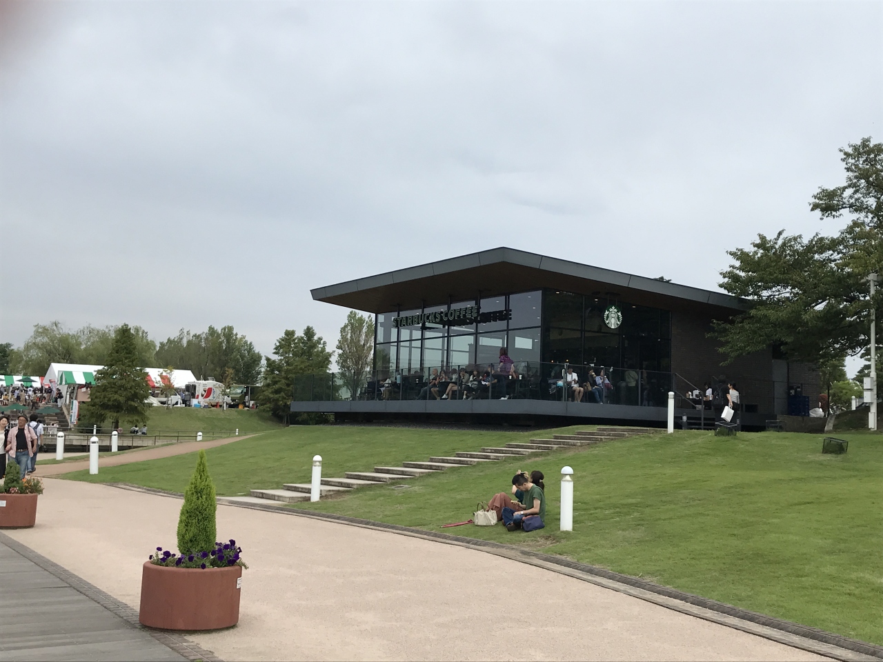世界一美しいスタバと聞いて、こんな地方になぜ?と思いましたが、運河を望む緑の公園の中にある施設を見てなるほどと思いました。この日は公園でイベントがあり、屋外まで大変な人で混雑していましたが、話によると夜間、ライトアップされた公園の中、お店の照明効果もあってとても美しく見えるそうです。
