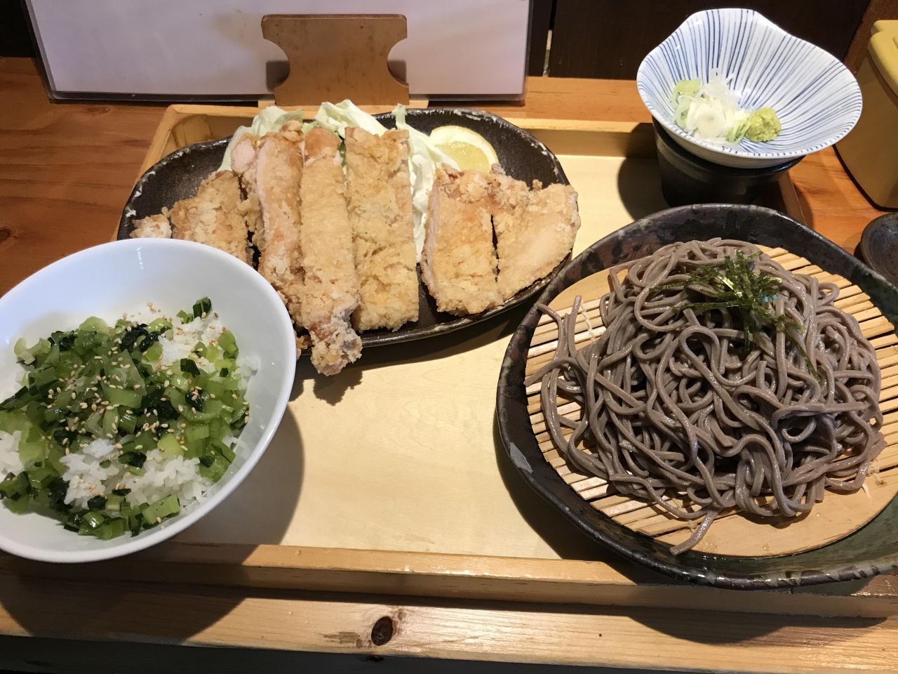 日本一の唐揚げ屋さんが駅ビルの中にあります。今回は田舎蕎麦とのセットを注文。からあげは相変わらず大きくカリッとあげてあり美味ですが、そば処のはずの田舎蕎麦の味はいまいち。欲張って蕎麦も楽しみたかったのですが、このお店では唐揚げだけで十分でした。