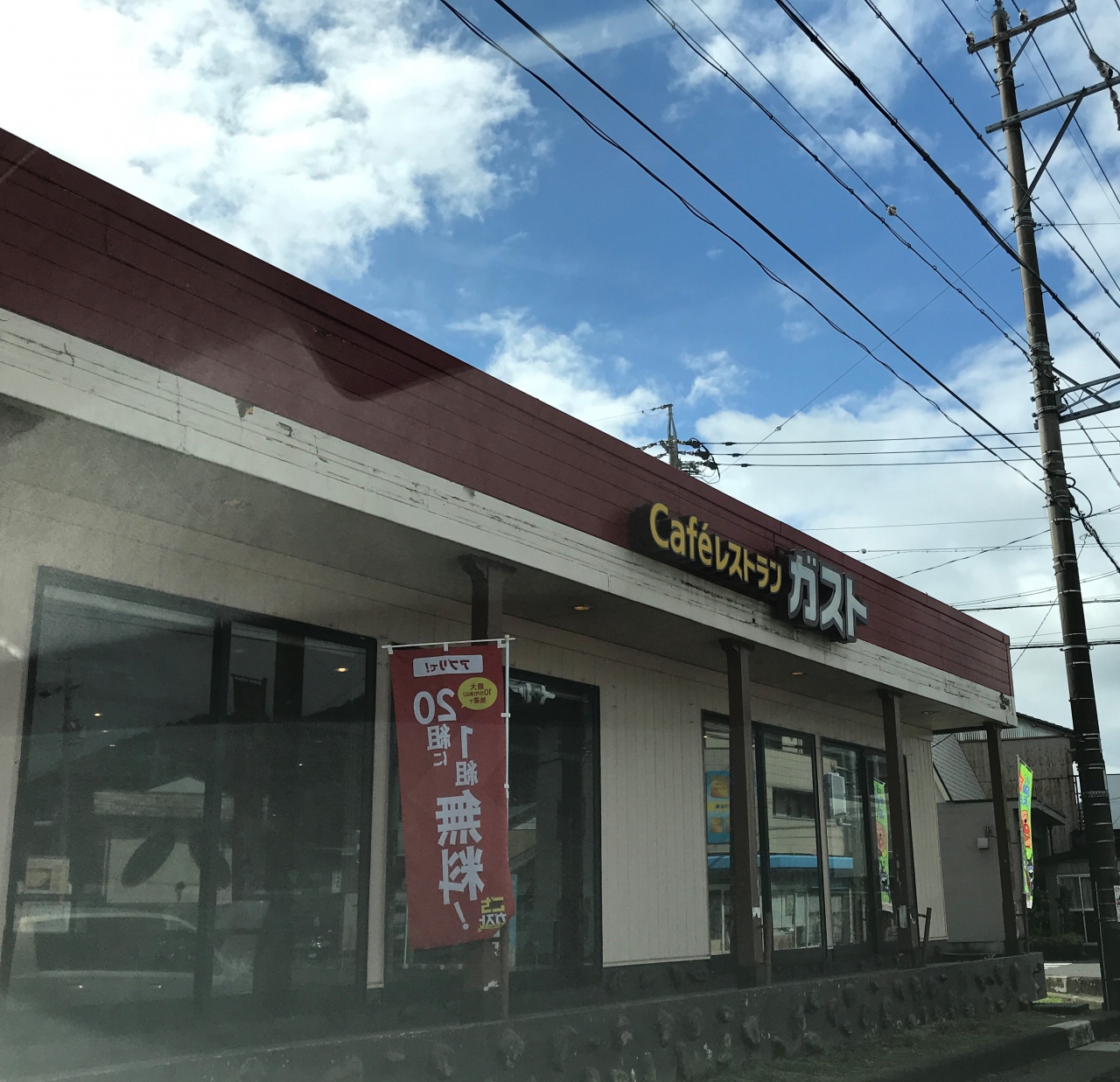 国道156号線沿いにあるファミレスでした。渋滞の名所ときいてましたが、路線バスに道をふさがれるところの様です。気分を変えてコーヒーでもとがストに入りましたが、駐車場は大混雑。駐車スペースが少ないせいの様です。休憩に入る車が後を絶たないので入店までちょっと駐車待ちしました。