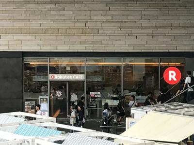 ライズの1階フロアをまっすぐ進むと目立つ楽天マークが見えます。手前の広場では大きなイベントをしていましたが十分わかりました。中は天井が高く、チョット音が反響するせいか落ち着きません。コーヒーは美味しく、スマホの充電もOKなのがうれしかったです。