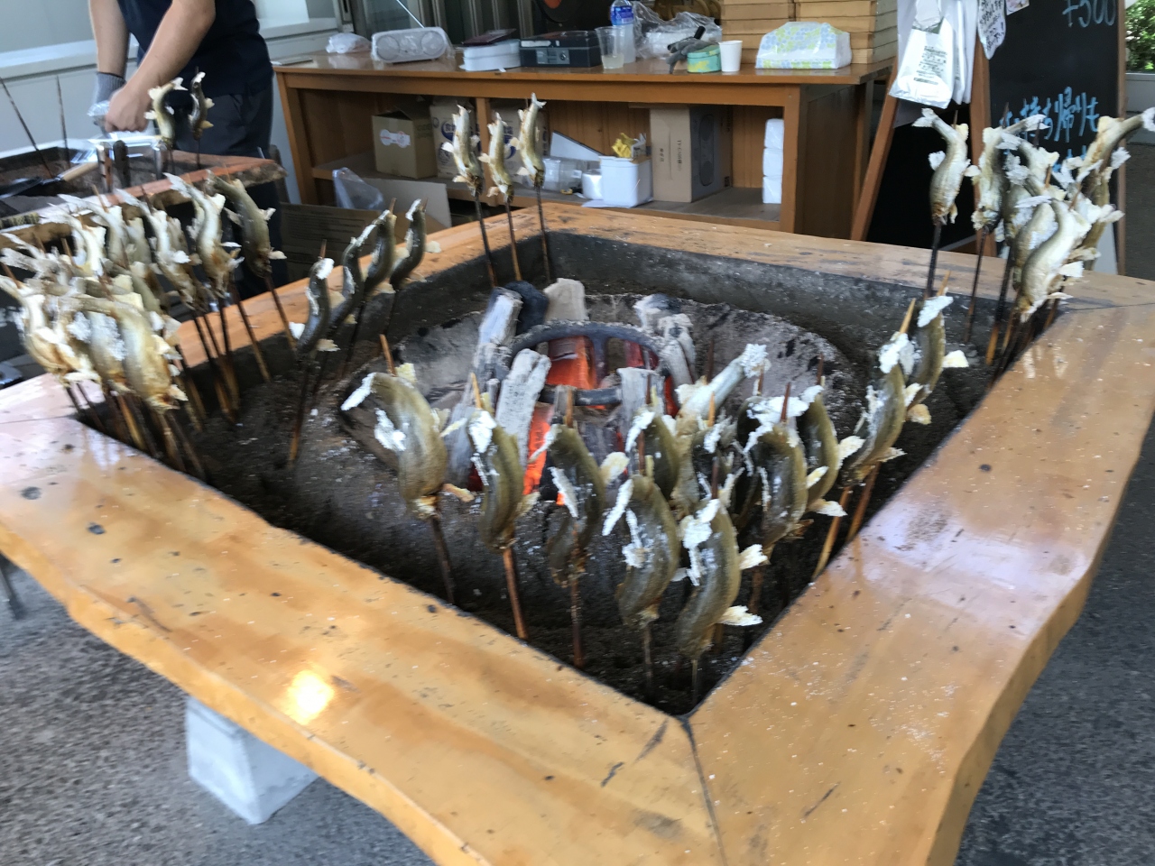 隣に立ち寄り湯の温泉があるせいか、足湯を楽しめる大きな施設があります。レストランも数店ありますあい、大きなお土産屋さんもあります。駐車場はいつもいっぱいの様でした。私のお目当ては、名物のアユの塩焼きですが30分待ちとのことで人気のほどがうかがえます。
