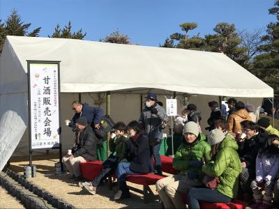 新春開門式は毎年訪れますが、昨年は残念な雪模様の天候でした。今年は見事に快晴で来場者数もかなり多かったように思えました。ここに来たら必ず寄るのが地元酒蔵が販売している酒麹で造った甘酒のお店です。この時しか味わえない味、最高です。