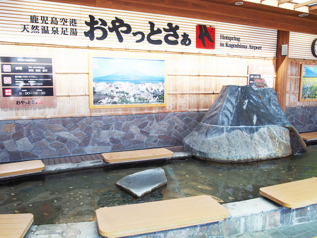 空港からバスターミナルのほうへ外に出るとすぐにある無料で楽しめる足湯です。