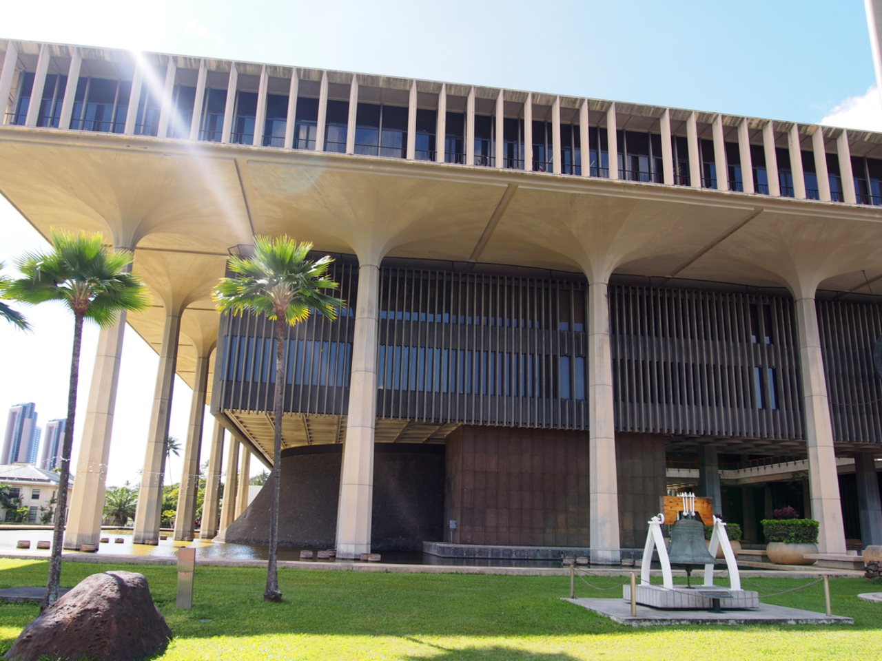 オアフのダウンタウン地区にあり、ワイキキからは車で15分程度でアクセスできる場所にあるハワイ州庁舎です。
